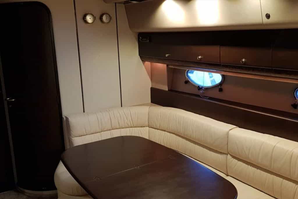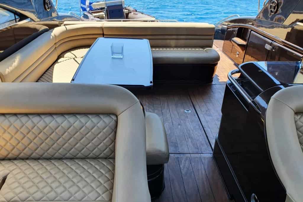 Her main deck has been purposely designed for those who enjoy true open-boating. The expansive cockpit features a large L-shaped seating area with additional seating aft around a substantial folding teak table served by a wetbar opposite with electric barbecue. This area connects to the saloon via a drop down sliding door and opening window aft of the galley, seamlessly integrating the two living areas as required. Her main deck also boasts a large sunpad located aft of the cockpit and a further foredeck seating and sunbathing area. With a top speed of 37 knots, she promises to deliver a powerful V Class sports yacht experience.