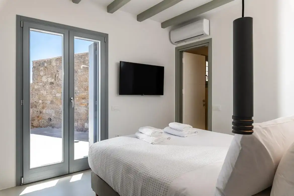 These sea front property (just 200 meters from the sea) benefit from a very convenient setting on a quiet bay, yet is only two kilometers from Mykonos Town with its restaurants, shops & night-life, and just five kilometers from the international airport as well as 800 meters from Ornos beach.