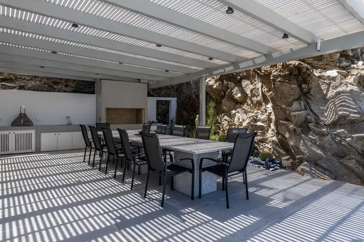 The surrounding terrain of a total area of 2.000 sq.m. has been professionally landscaped with terraced gardens. A garden pavilion has been placed on the villa’s surroundings to take advantage of the wonderful views. Flanked by broad terraces, which offer a pool bar and pergola-covered seating areas, the stunning horizon-edge swimming pool create the impression of swimming in the Aegean.