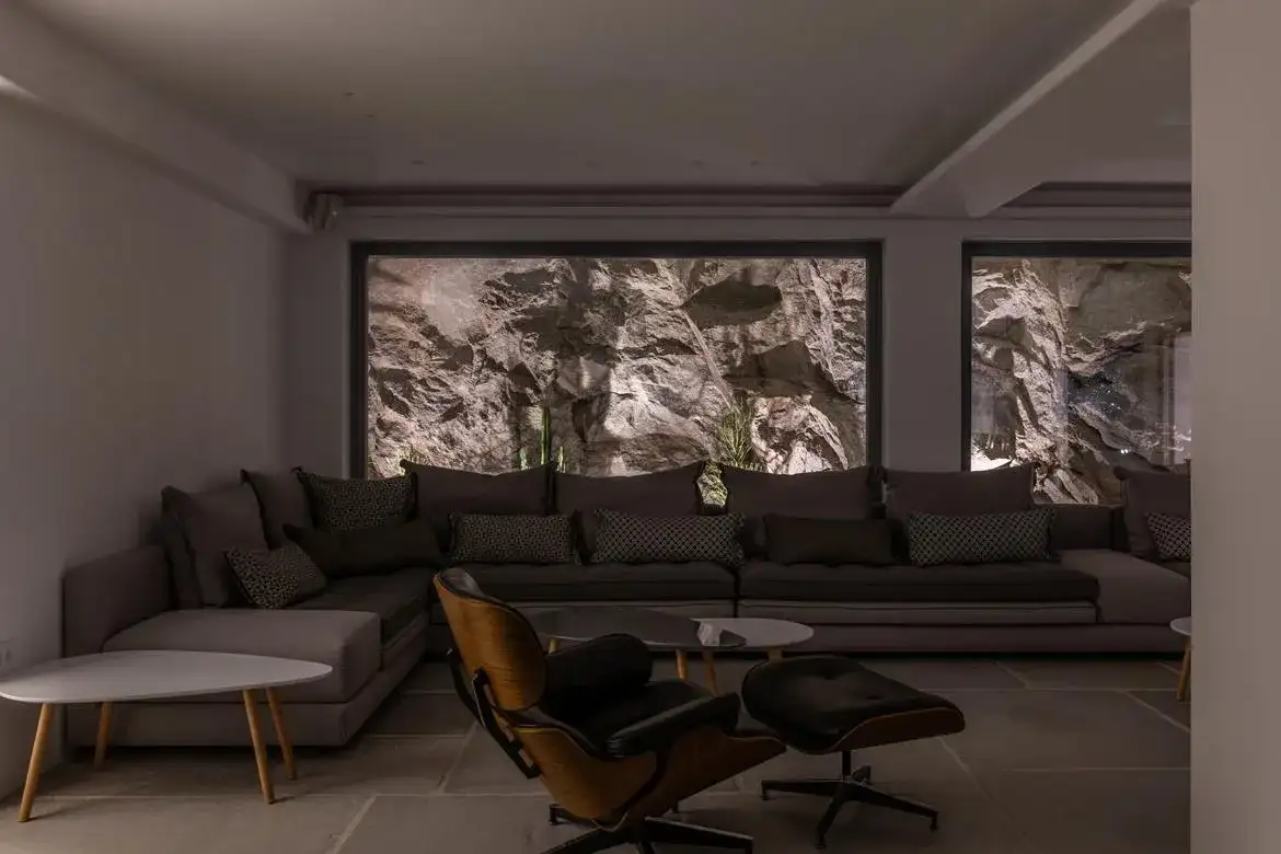Architectural features include exposed stone walls, beautiful stone crafted floors, and white wood-beam ceilings. A sophisticated lighting system, air conditioning and autonomic radiant heat are featured throughout. Custom-designed beds, sofas, coffee tables, shutters, and exterior day-beds have been created specifically for this residence. A selection of high-end materials has been artistically combined with an exclusive individual design to create a fresh and modern décor for this villa.