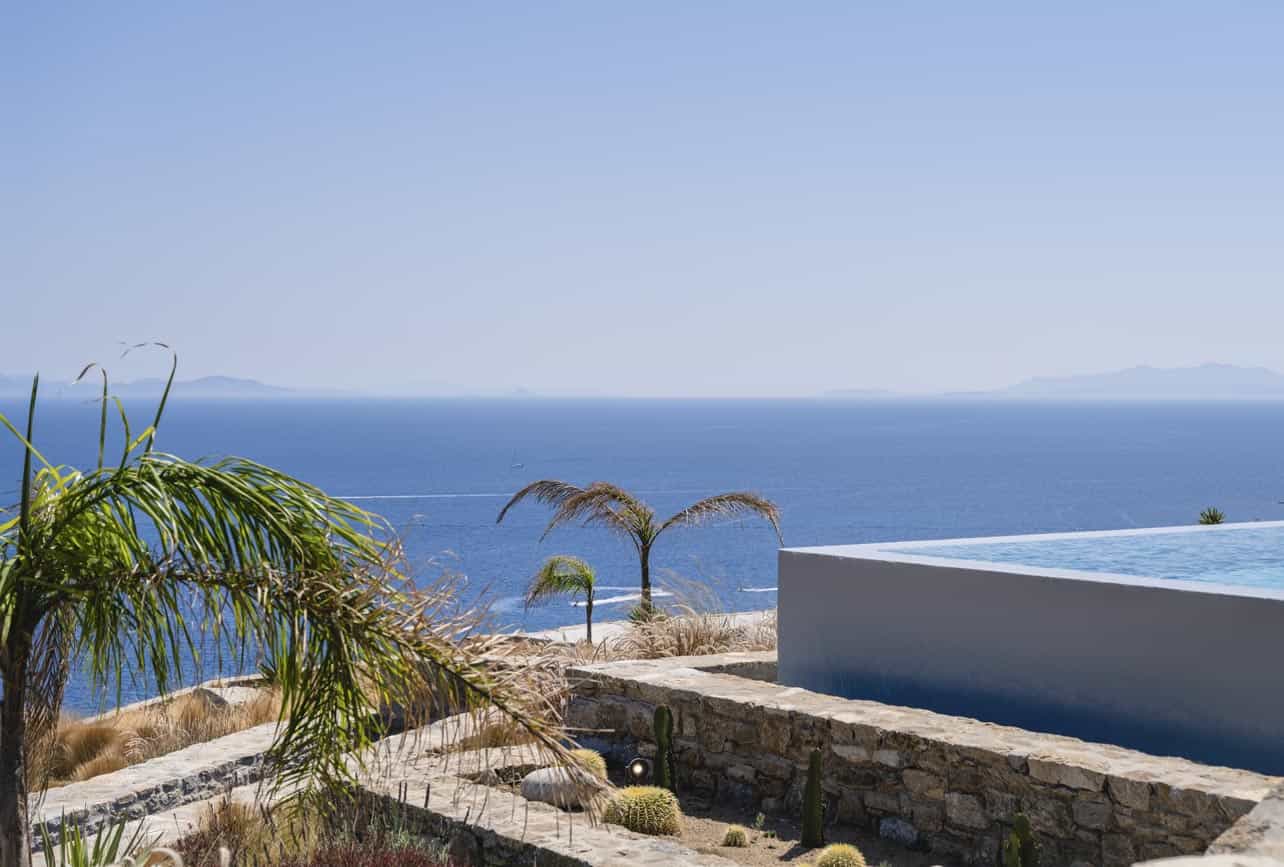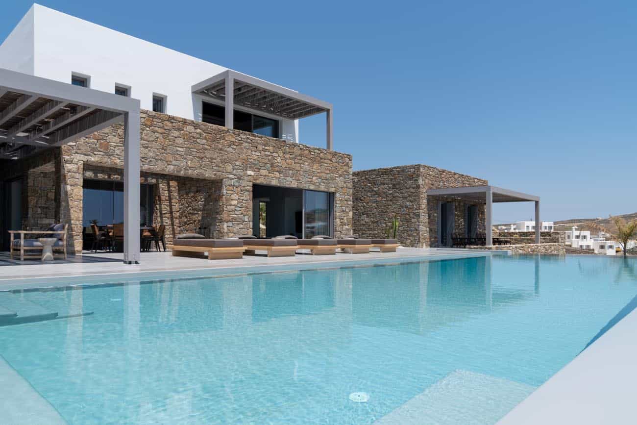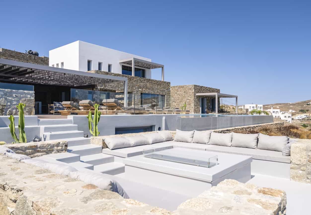 Unravel the tangle of Antigoni, discovering one by one all the interesting, elegant, and tastefully made corners of this modern, luxurious, and brand new Mykonian house. A high-level team in the field of luxury home architecture supervised the creation of a unique holiday home that satisfies the tastes of its visitors with its modern construction, high-quality materials, and functionality. The legend takes place in a quiet and private house in the area of Elia in a field of4.100 m²,250 m from the beach, and with a breathtaking view of 180 degrees inviting the visitor to enjoy its comforts and the endless blue as in the background will appear the islands of Paros and Naxos. You can swim in the 82 m2 swimming pool or visit the sandy beach of Elia in just five minutes by car or other nearby southern beaches of the island. If you want to relax you can choose one of the four terraces with their living rooms. If you like cooking choose between the indoor kitchen or the BBQ. Do your daily work-out in the modern gym with Matrix fitness instruments. As the sun shines you can sunbathe and enjoy the incomparable view at the outdoor living room by the pool. Watch the sun meeting the sea while you enjoy your drinks around the open fireplace. Indulge yourself with a luxurious vacation along with your loved ones while maintaining your privacy as at a walking distance from the Main House is the Guest House which is a whole independent house. The earthy materials of this construction, such as stone and wood, as well as the rich garden with its special corners will create the feeling of absolute relaxation, and direct contact with nature, creating the ideal environment for your summer vacation.