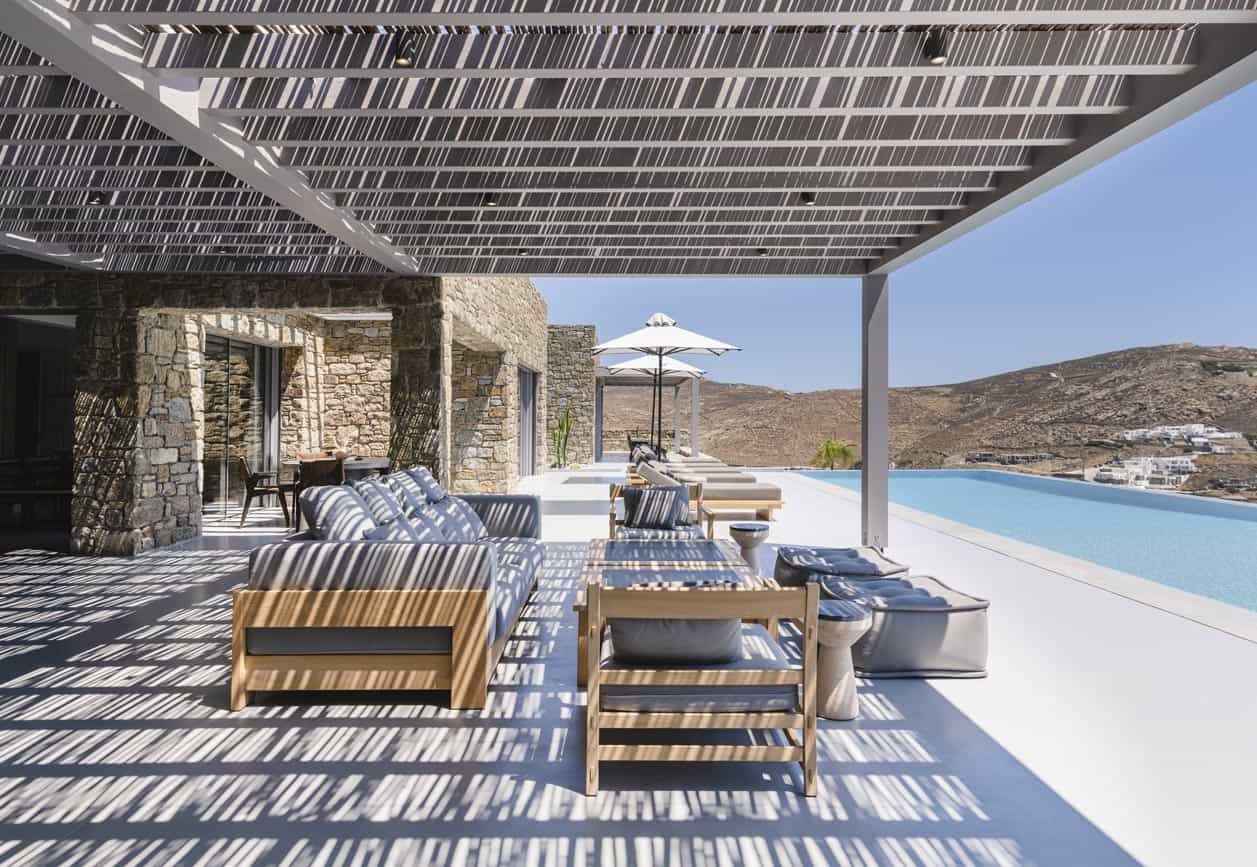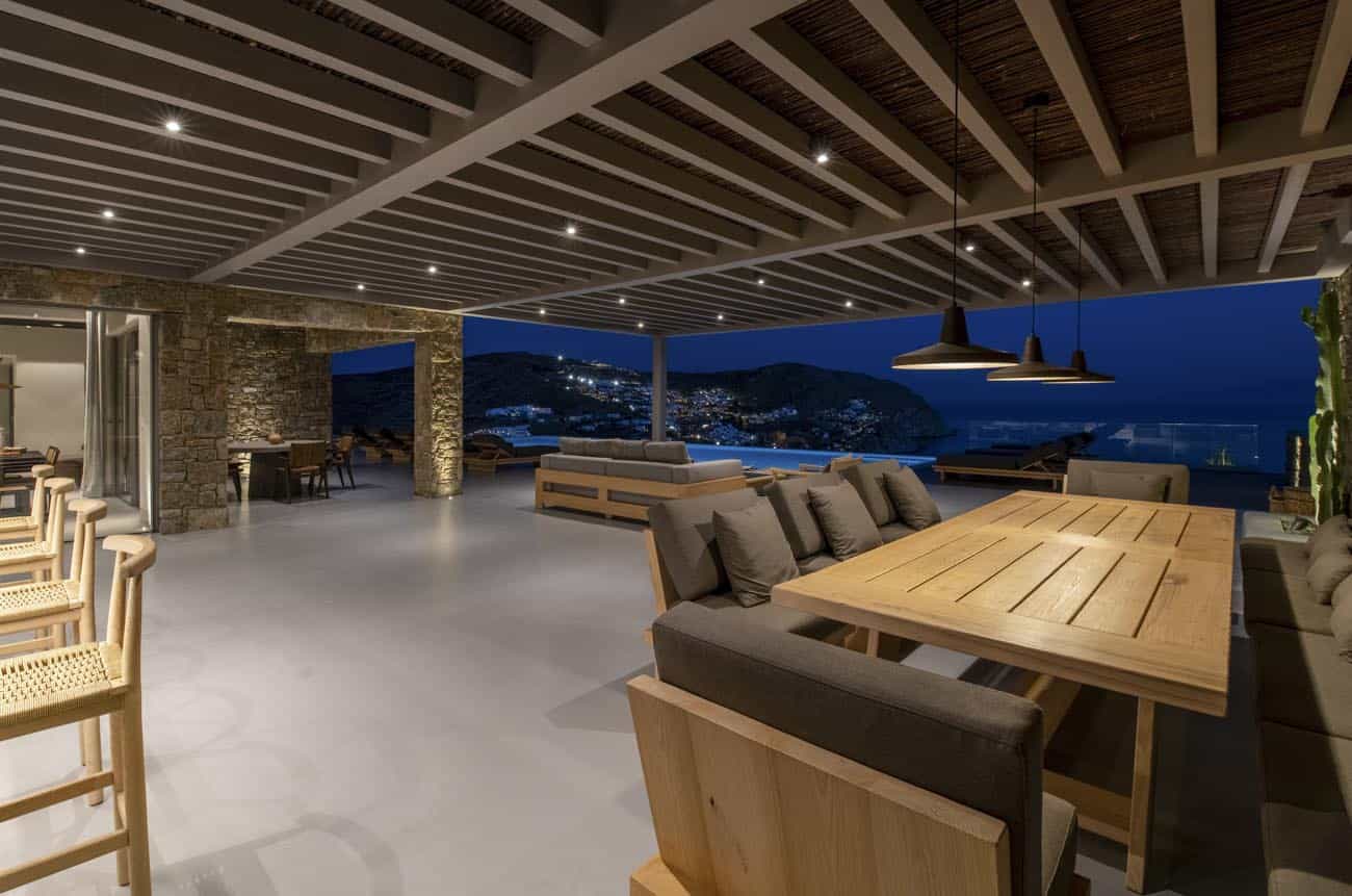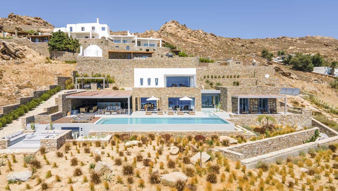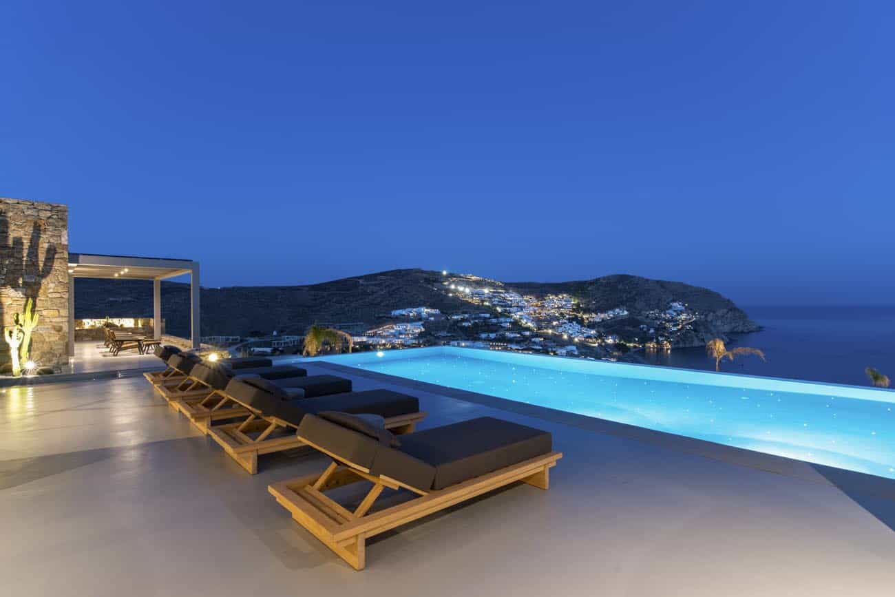 Unravel the tangle of Antigoni, discovering one by one all the interesting, elegant, and tastefully made corners of this modern, luxurious, and brand new Mykonian house. A high-level team in the field of luxury home architecture supervised the creation of a unique holiday home that satisfies the tastes of its visitors with its modern construction, high-quality materials, and functionality. The legend takes place in a quiet and private house in the area of Elia in a field of4.100 m²,250 m from the beach, and with a breathtaking view of 180 degrees inviting the visitor to enjoy its comforts and the endless blue as in the background will appear the islands of Paros and Naxos. You can swim in the 82 m2 swimming pool or visit the sandy beach of Elia in just five minutes by car or other nearby southern beaches of the island. If you want to relax you can choose one of the four terraces with their living rooms. If you like cooking choose between the indoor kitchen or the BBQ. Do your daily work-out in the modern gym with Matrix fitness instruments. As the sun shines you can sunbathe and enjoy the incomparable view at the outdoor living room by the pool. Watch the sun meeting the sea while you enjoy your drinks around the open fireplace. Indulge yourself with a luxurious vacation along with your loved ones while maintaining your privacy as at a walking distance from the Main House is the Guest House which is a whole independent house. The earthy materials of this construction, such as stone and wood, as well as the rich garden with its special corners will create the feeling of absolute relaxation, and direct contact with nature, creating the ideal environment for your summer vacation.