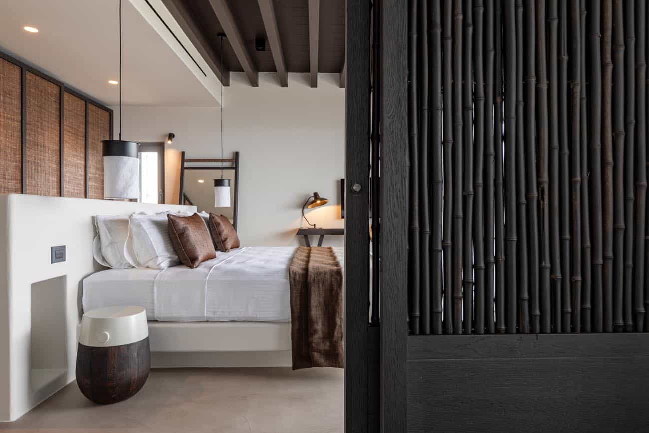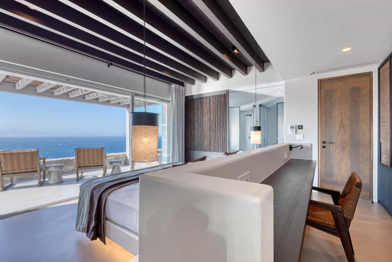 master bedroom with queen size bed, TV, open plan en suite bathroom with a bathtub with direct sea view via a window, direct access to a private balcony, [panoramic sea view