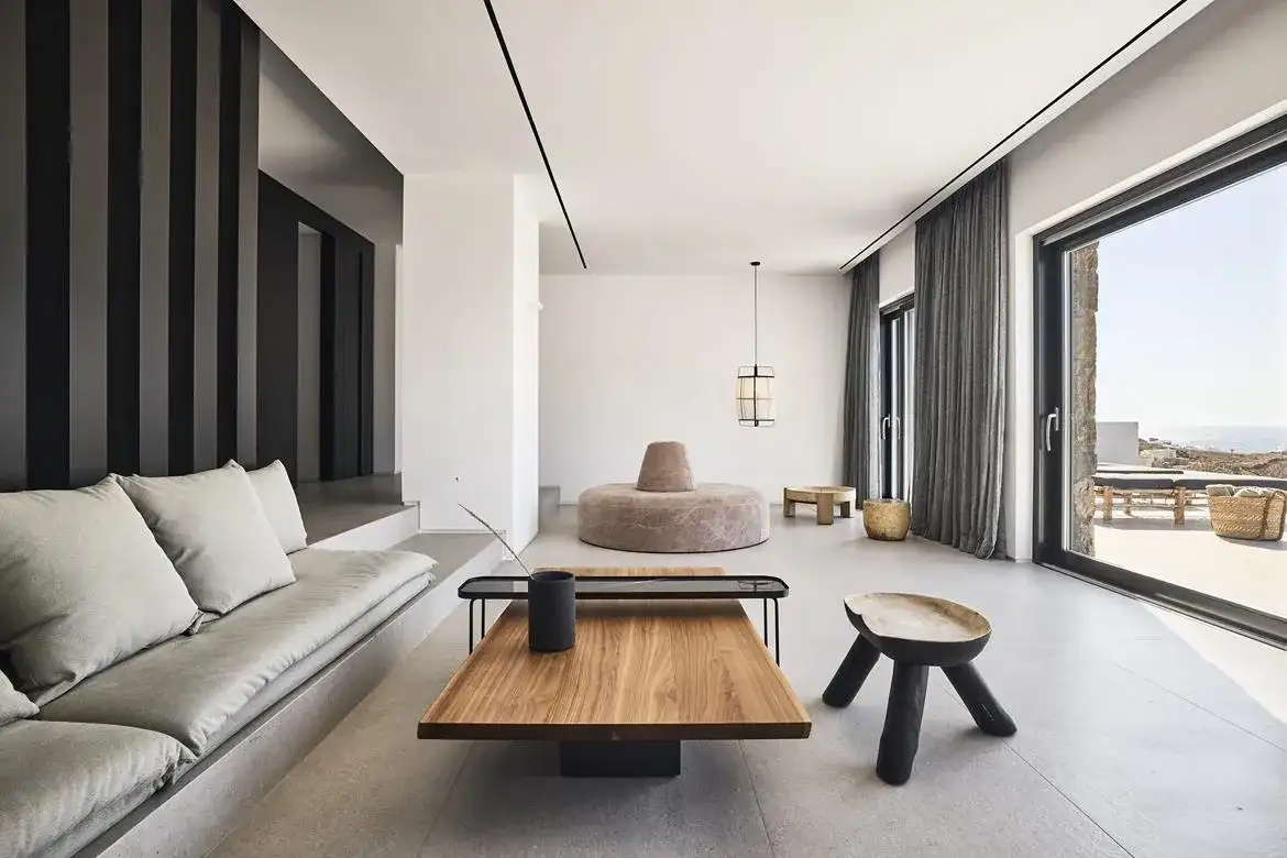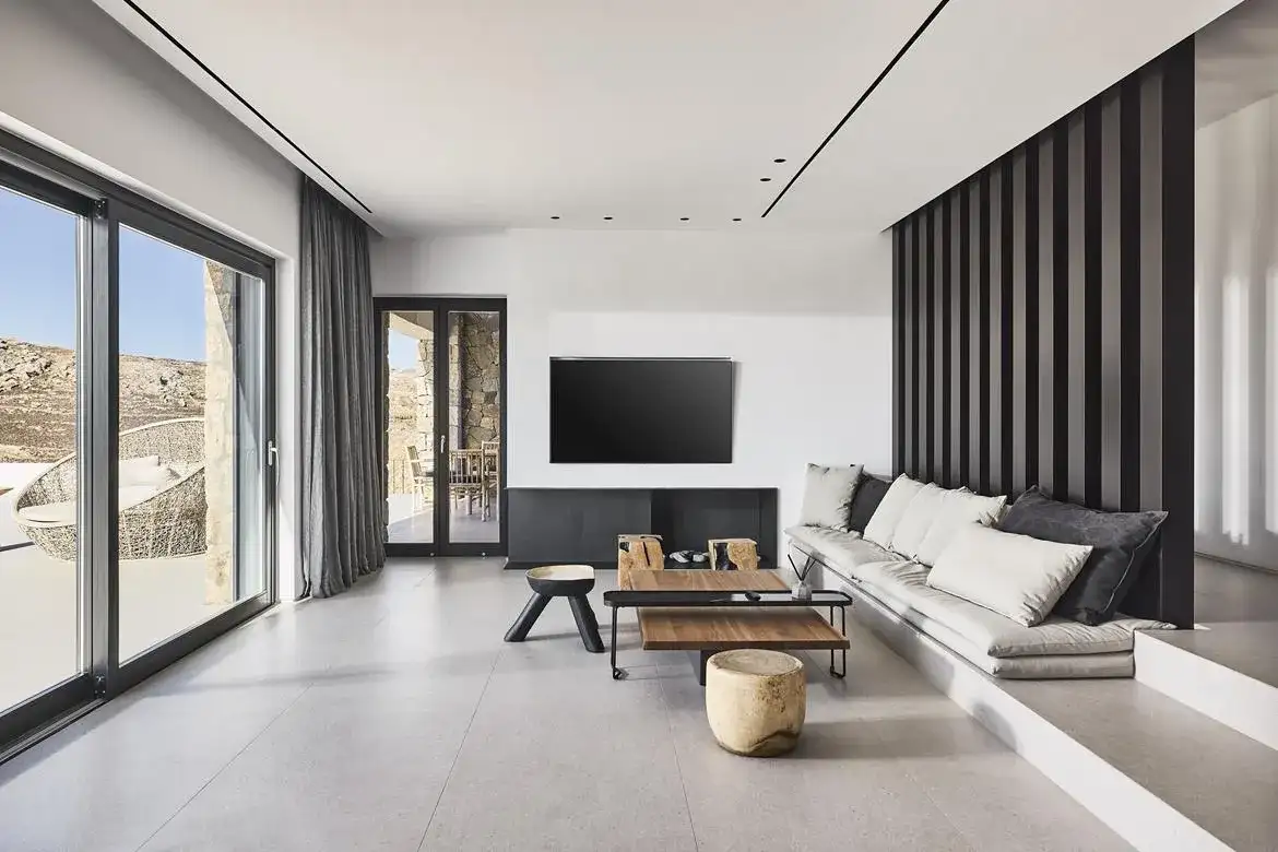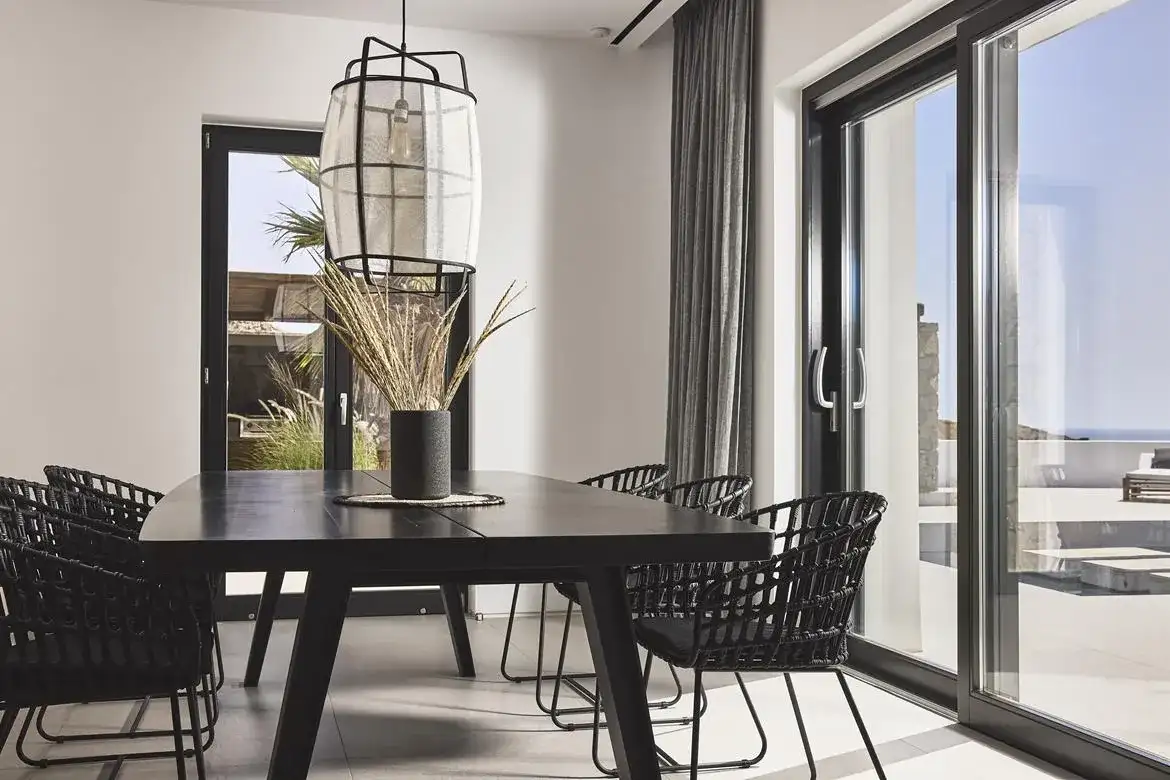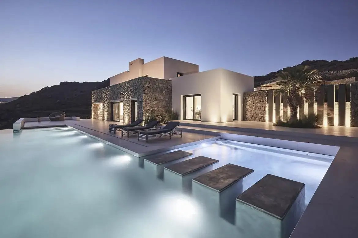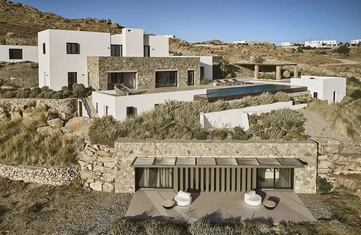 Villa Aria is a newly built 6-bedroom villa overlooking Kalo Livadi beach, which blends gracefully with the natural landscape of its location and offers panoramic sea views. The elegant property expands on 2 levels: the upper level features the main unit, which hosts the main living and kitchen/dining areas along with 3 en suite double bedrooms (interior space), and the main exterior space which hosts the Infinity pool with the main outdoor sitting and dining areas. The lower level features 3 additional suites with independent entrances, two of which share a veranda with a sea view and lounge spots, and the staff room (staff-in-house). Designed elegantly down to the last detail and combining a clean architectural style with a minimal yet luxurious decoration, Villa Aria offers its guests the ultimate chance to experience the Greek hospitality, unwinding and relaxing in privacy