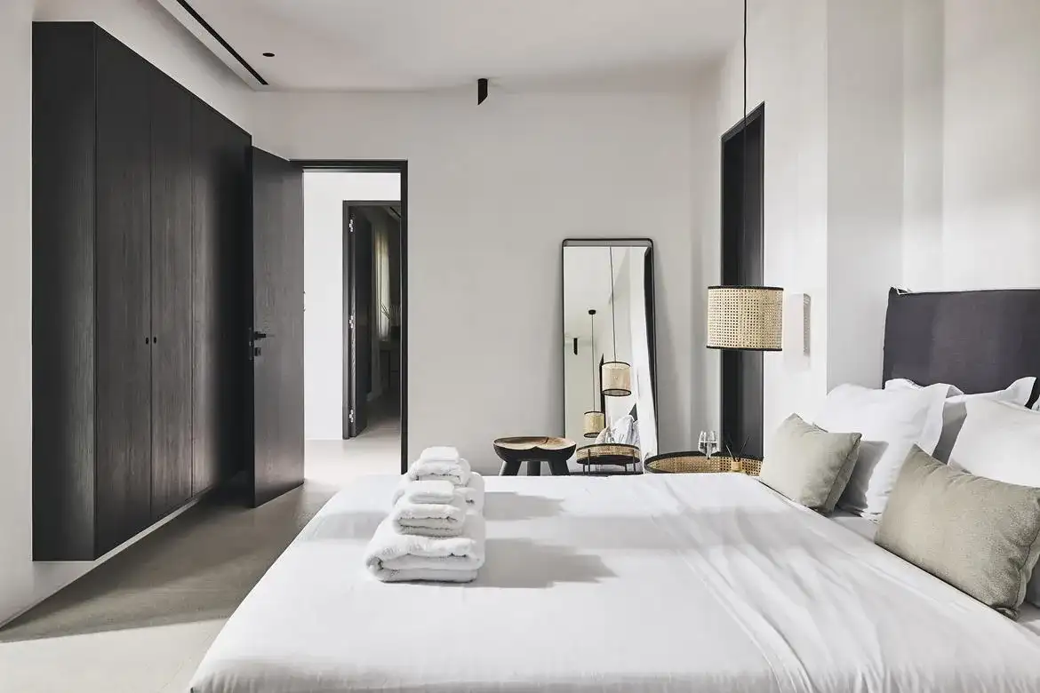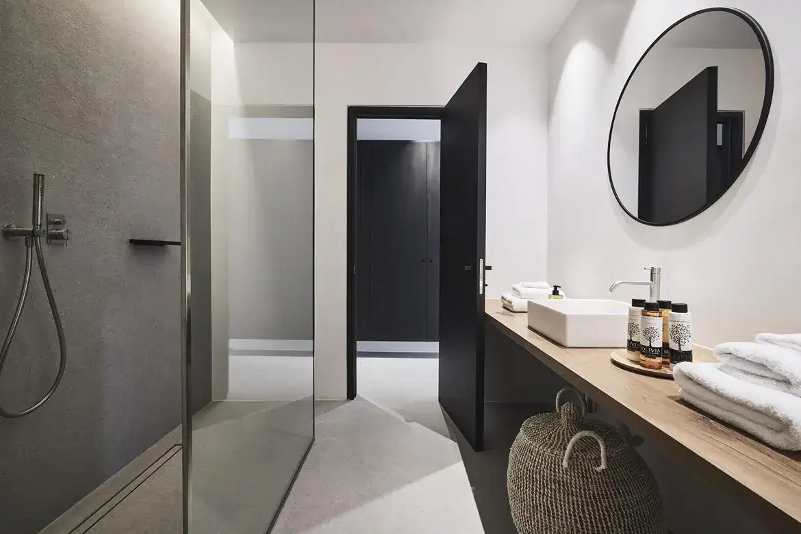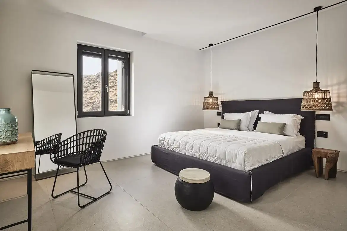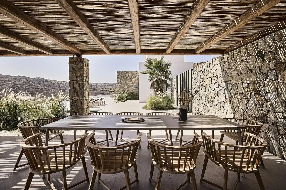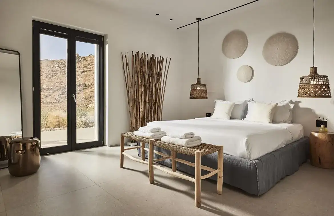 Villa Aria is a newly built 6-bedroom villa overlooking Kalo Livadi beach, which blends gracefully with the natural landscape of its location and offers panoramic sea views. The elegant property expands on 2 levels: the upper level features the main unit, which hosts the main living and kitchen/dining areas along with 3 en suite double bedrooms (interior space), and the main exterior space which hosts the Infinity pool with the main outdoor sitting and dining areas. The lower level features 3 additional suites with independent entrances, two of which share a veranda with a sea view and lounge spots, and the staff room (staff-in-house). Designed elegantly down to the last detail and combining a clean architectural style with a minimal yet luxurious decoration, Villa Aria offers its guests the ultimate chance to experience the Greek hospitality, unwinding and relaxing in privacy