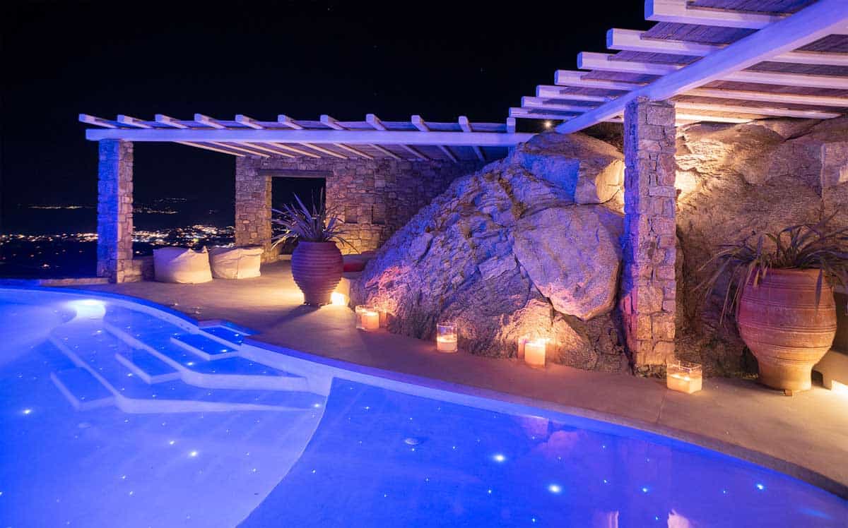 The amazing 90 sq.m. tear-drop shaped infinity pool with Jacuzzi and fiber optics, is undoubtedly the villas jewel. Remarkable outdoor dining, sitting and bar areas, excellent gardens that will only take your breath away.