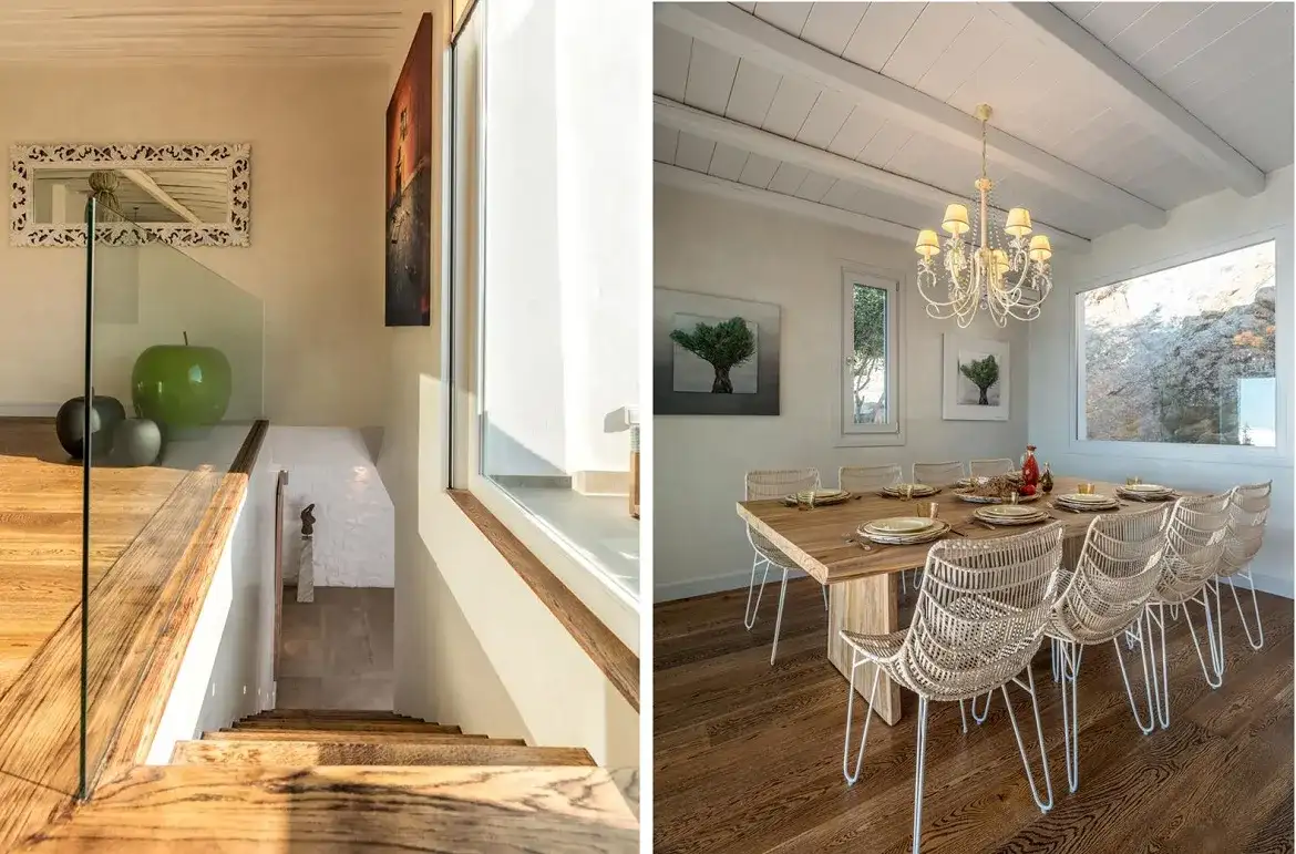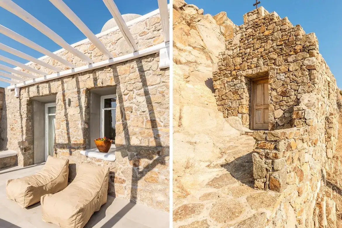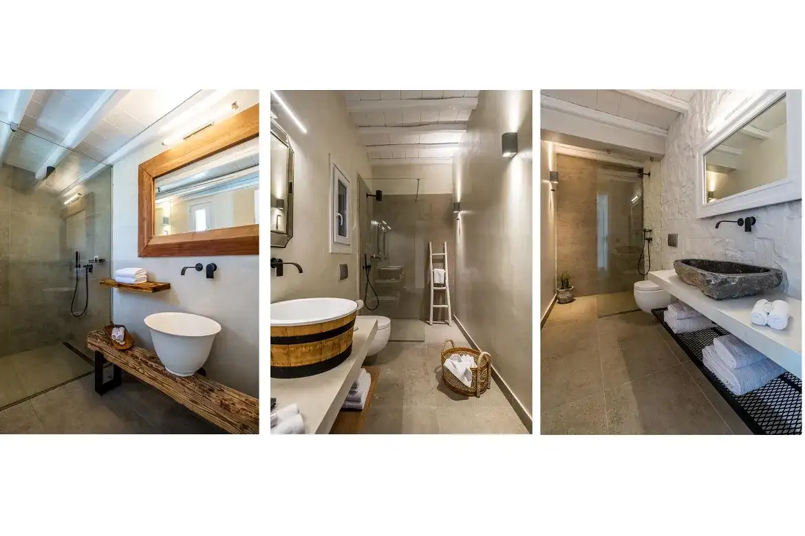 The main house hosts the main interior living and dining spaces, the kitchen, 4 bedrooms (out of which the 3 en suite), and 1 guest bathroom which also serves as a bathroom for the 4th bedroom. The living and dining spaces, 2 of the bedrooms (1 of which en suite), and the guest bathroom are located at the upper level of the house (pool level). The other 2 en suite bedrooms are located at the lower level (ground level). 2 en suite guestrooms are located outside of the main house (separate entrance), out of which 1 is at the pool level and 1 at the ground level. All bedrooms have sea/sunset views. The outdoor area features the Infinity pool, a built-in BBQ (charcoal), the main sitting area (upper/pool level), and additional sitting areas on both levels. The Chapel is located on a small cliff at the highest level of the property, overlooking the house.
