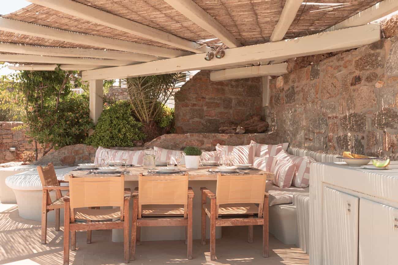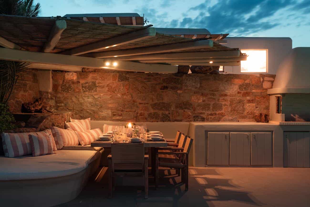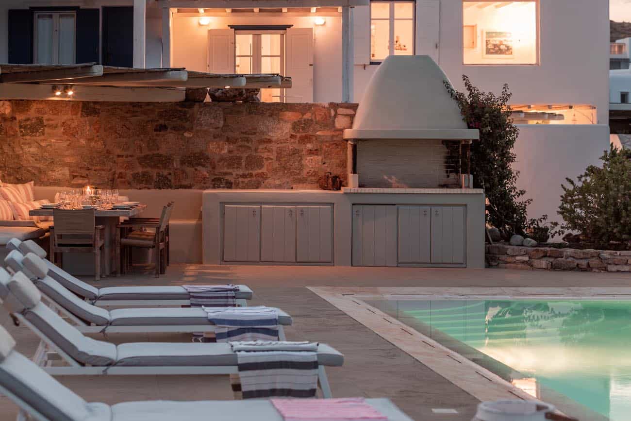 Outside, the villa’s beautiful pool terrace will literally take your breath away as it boasts 360̊ views to the rough plains of the area and the mesmerizing sea. The large swimming pool is surrounded by sun loungers and comfy armchairs that breathe in every inch of the villa’s Mediterranean scenery. Numerous pergola-shaded lounging areas with stone built sofas along with its al fresco dining setting right by the barbeque complement the absolute summer bliss offered by this villa .