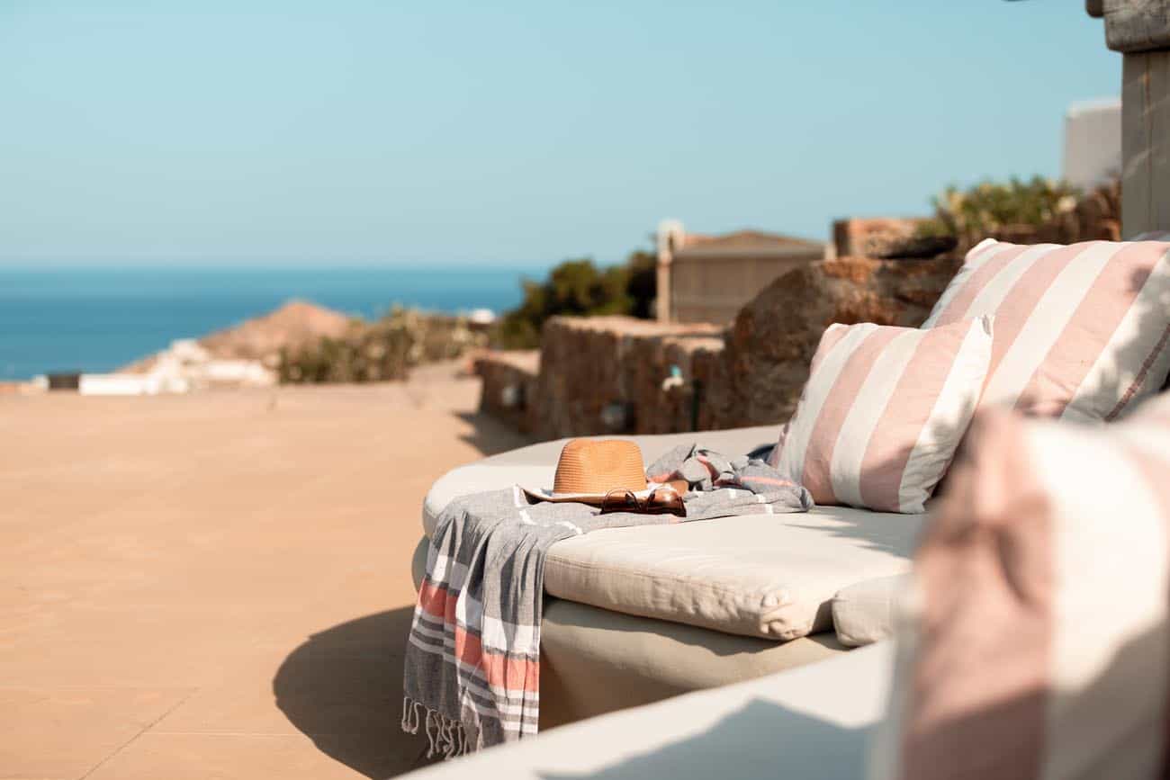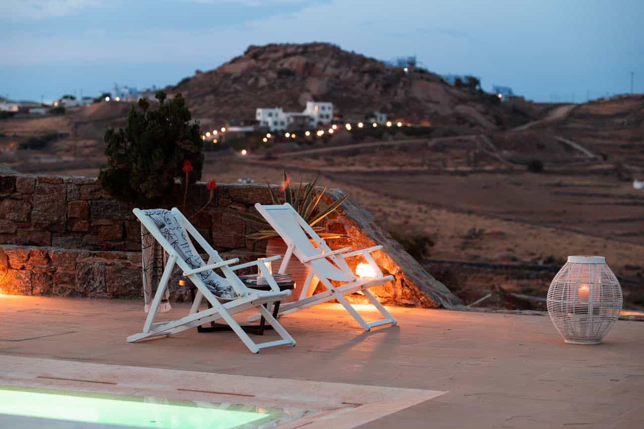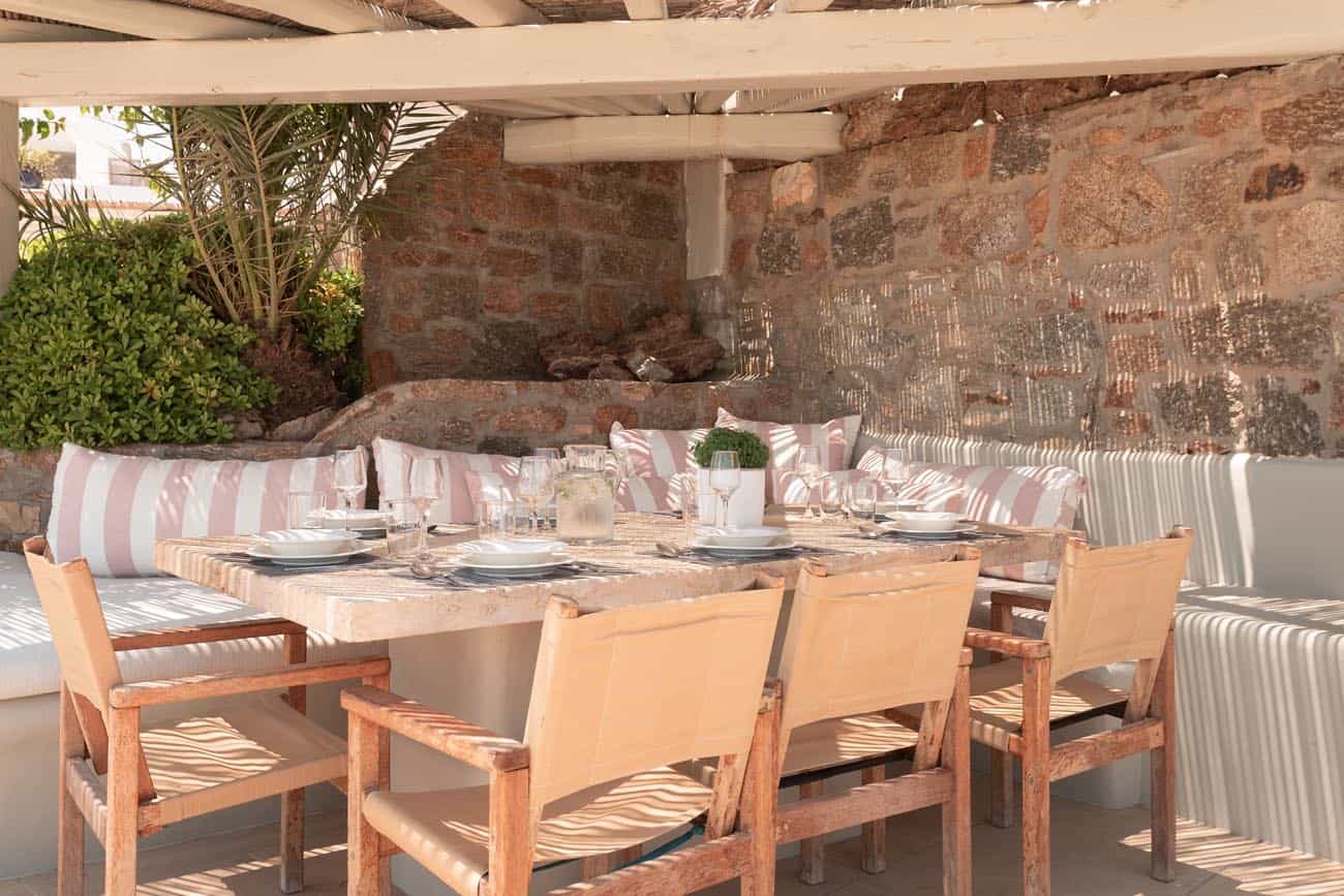 Outside, the villa’s beautiful pool terrace will literally take your breath away as it boasts 360̊ views to the rough plains of the area and the mesmerizing sea. The large swimming pool is surrounded by sun loungers and comfy armchairs that breathe in every inch of the villa’s Mediterranean scenery. Numerous pergola-shaded lounging areas with stone built sofas along with its al fresco dining setting right by the barbeque complement the absolute summer bliss offered by this villa .