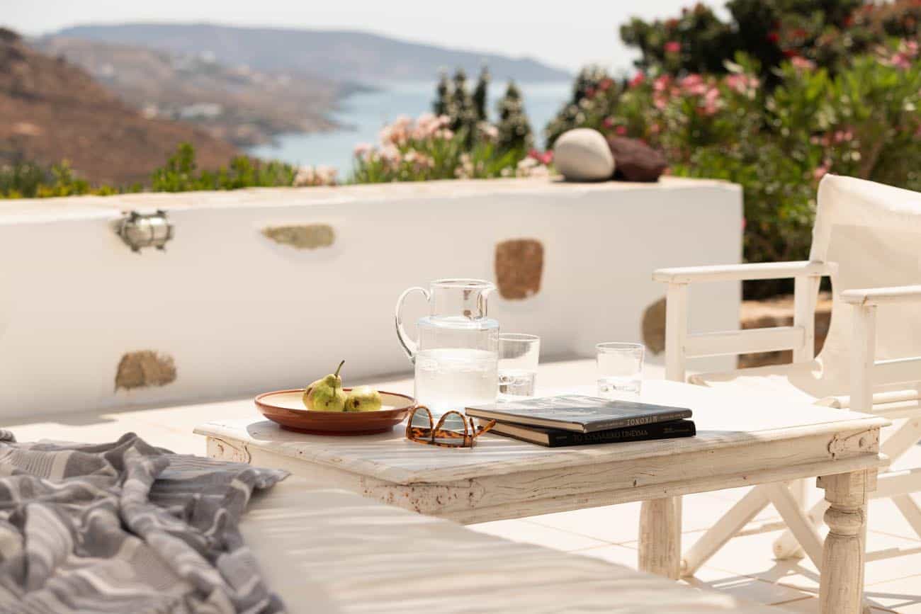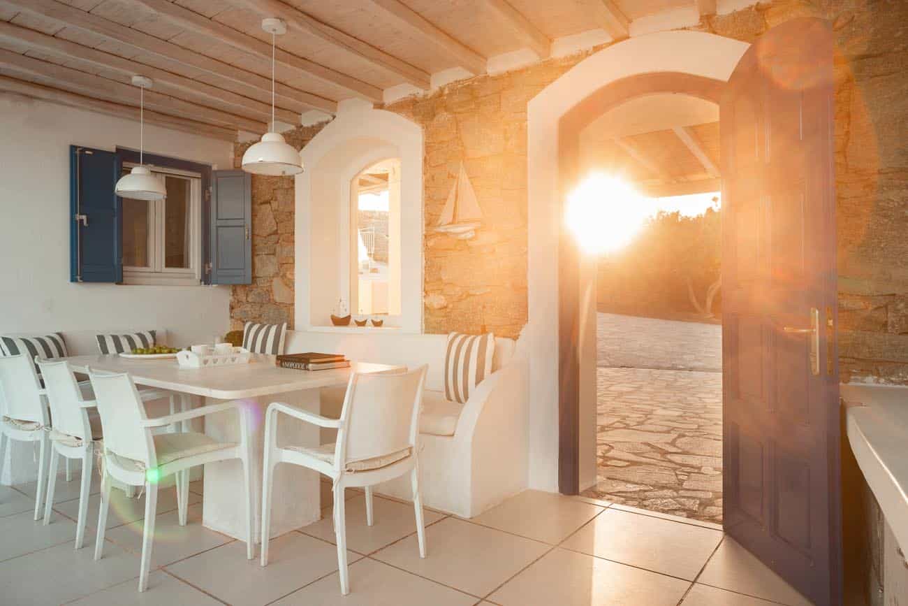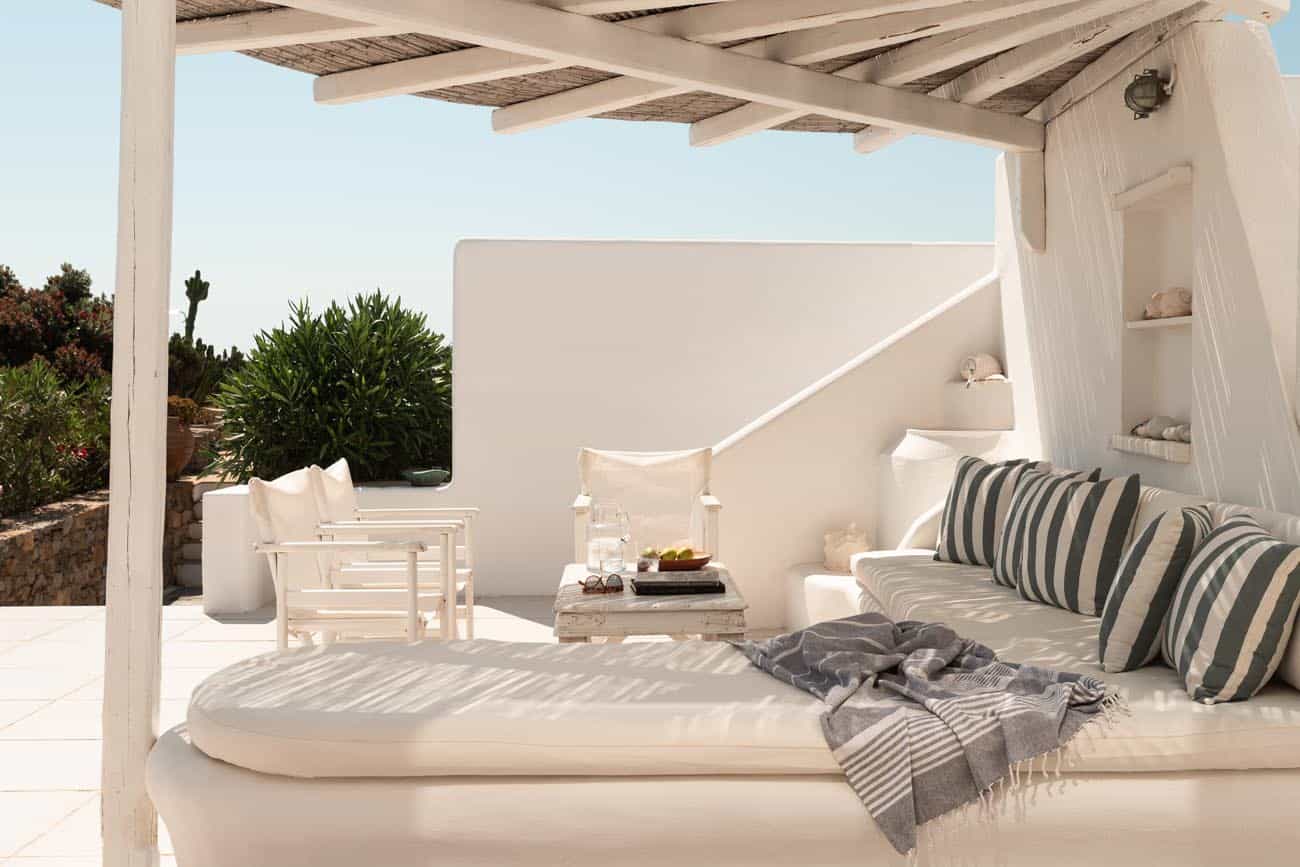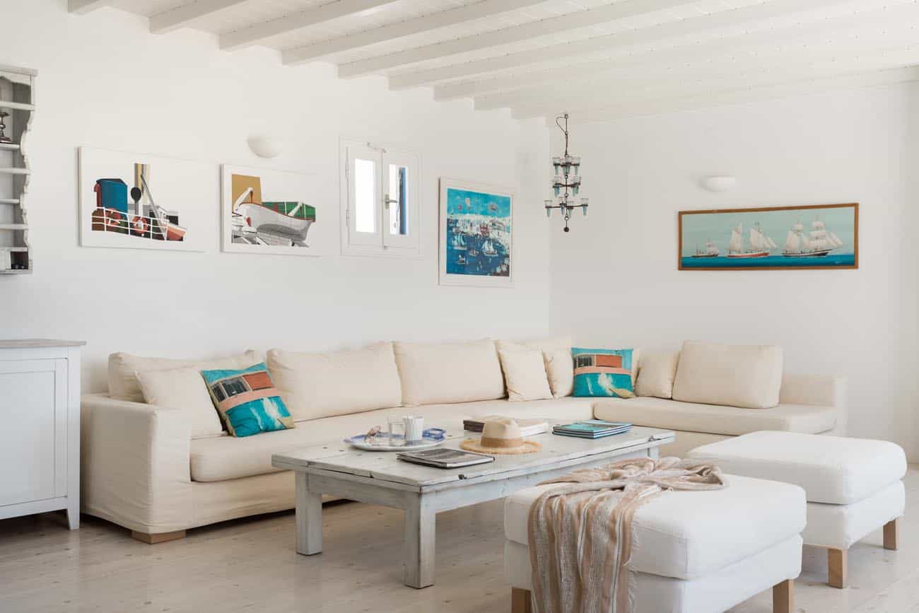 Ample and luminous, the villa offers an utterly soothing ambience in all interior spaces where its bright white and soft beige tones on the walls and all furnishings create an aura of freedom and purity. Decorated with a contemporary, minimal mood along with smart antique details, this is a property that will guide you through the authentic Mykonian living.
