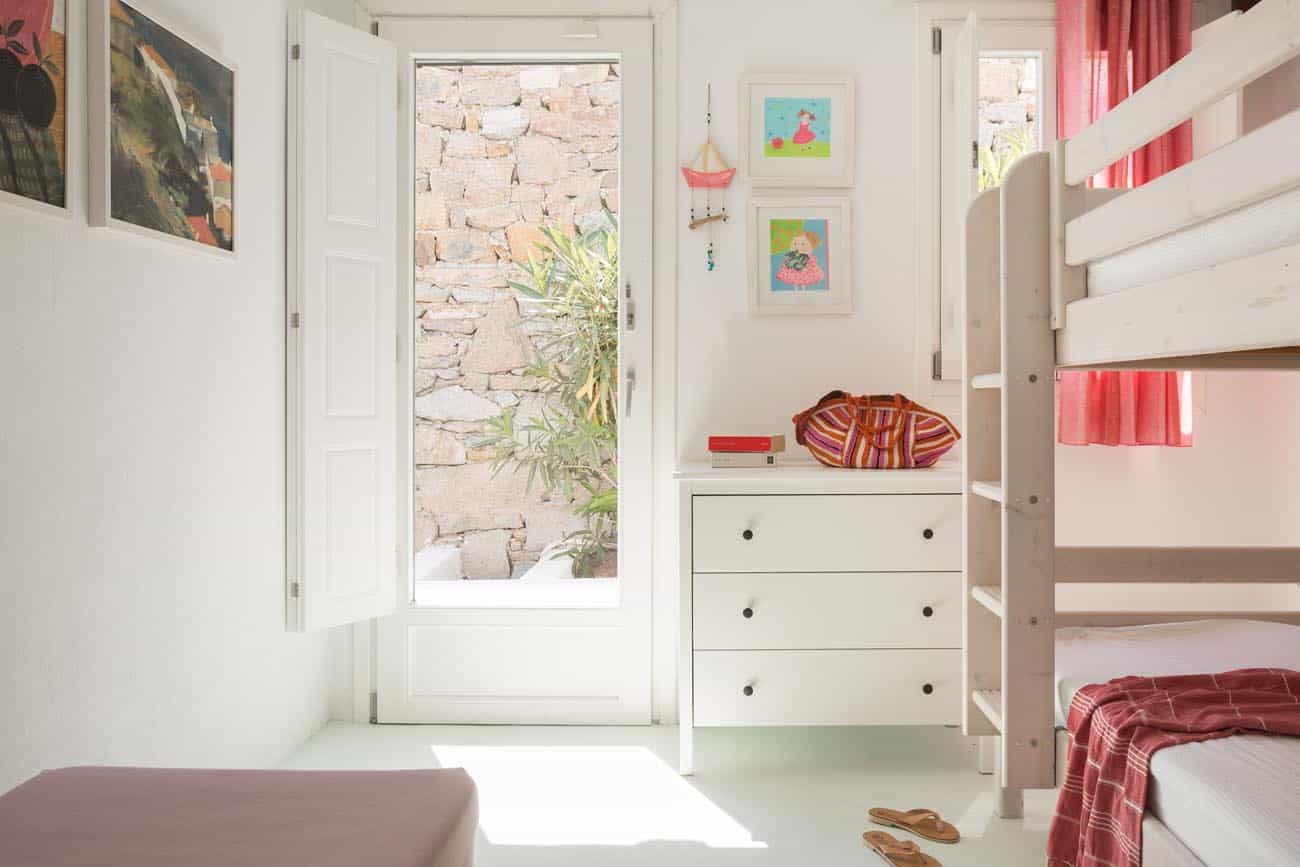 Its ground level hosts its country chic, fully equipped kitchen and a few steps up you will find yourself in the villa’s cosy living room with windows overlooking the Aegean Sea as well as its charming dining area. In this level you will also find a double bedroom with bathroom and a twin with en-suite shower room. The pool level of the villa hosts the rest sleeping quarters of the property with a charming master en-suite bedroom, a double one with en-suite shower and a children’s room with bunk beds and shower. The separate guesthouse features a spacious double bedroom with en-suite bathroom that will offer privacy and seclusion to a couple.