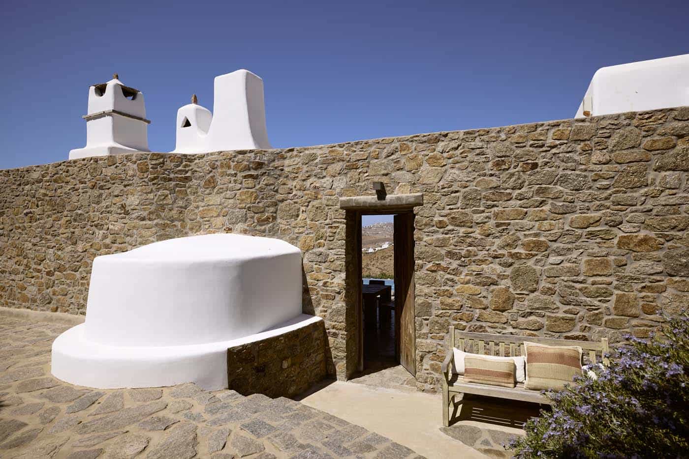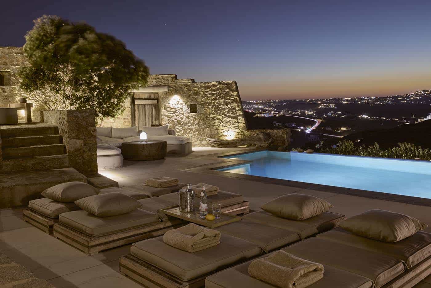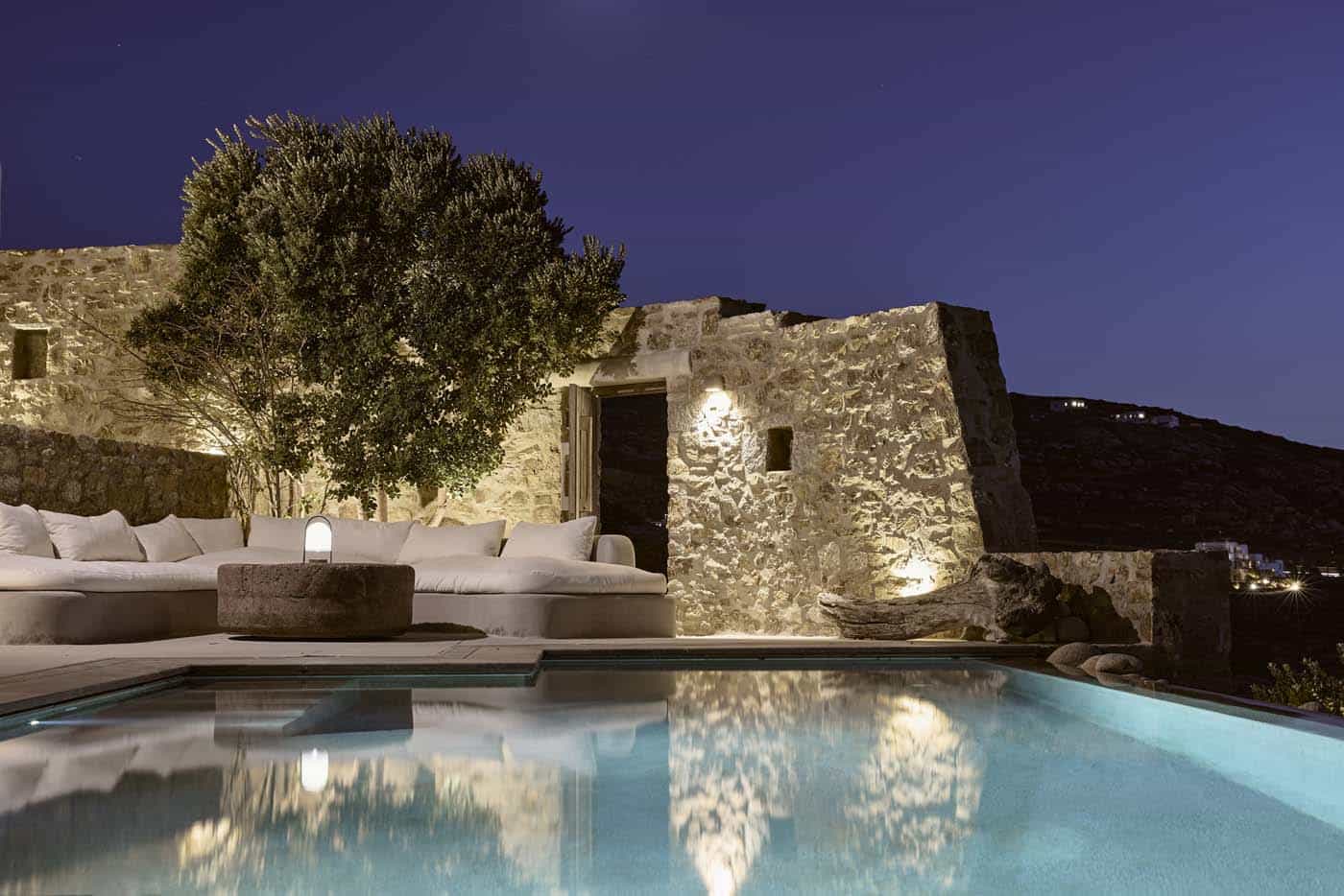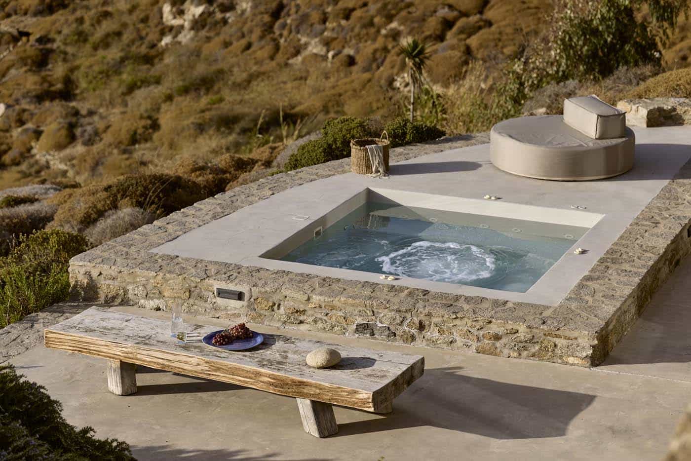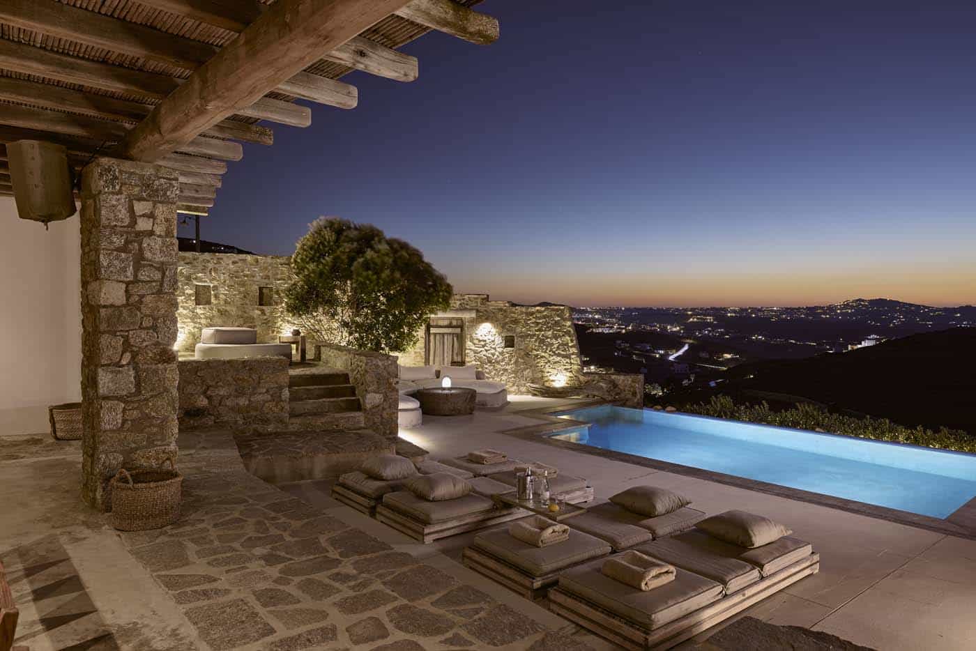 The guests have access to the 2 pools in the property (one of which may be heated upon request), the outdoor Jacuzzi, the beautiful gardens that surround the villa and the gym, while the Hammam facilities are available upon request. The outdoor dining area is situated right above the pool and offers a truly astounding view of the Aegean sky and sea. The suites feature rustic furnishings and spacious balconies or verandas.