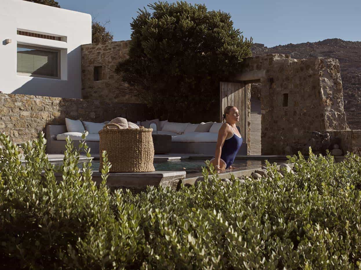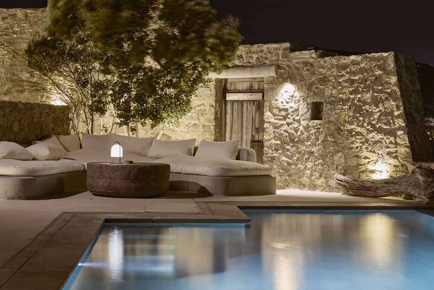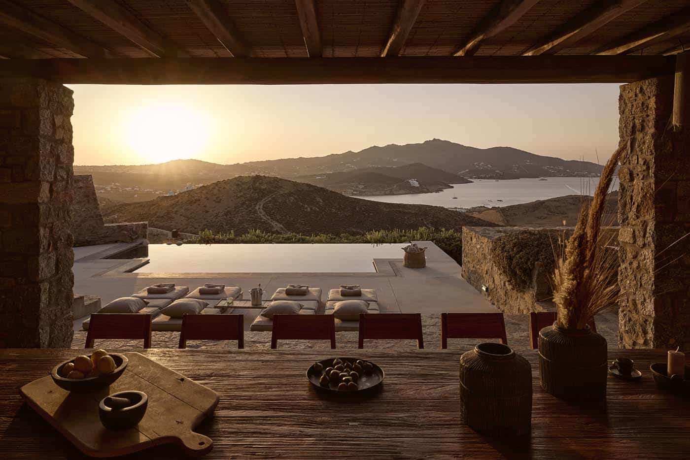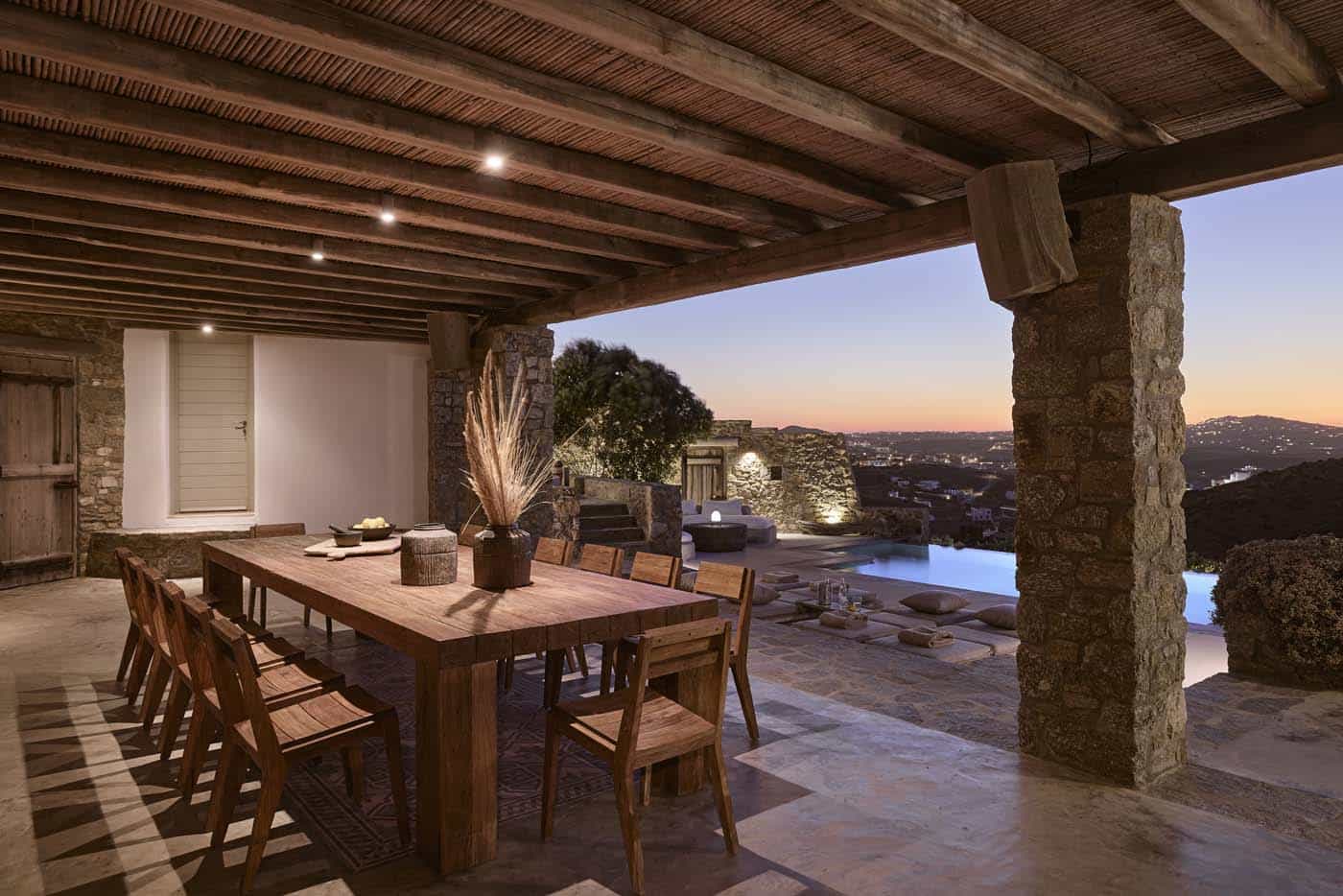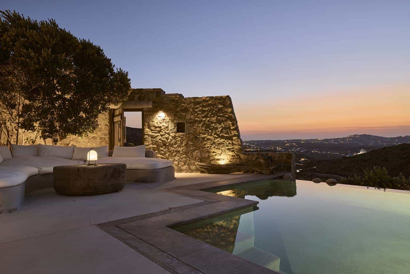The guests have access to the 2 pools in the property (one of which may be heated upon request), the outdoor Jacuzzi, the beautiful gardens that surround the villa and the gym, while the Hammam facilities are available upon request. The outdoor dining area is situated right above the pool and offers a truly astounding view of the Aegean sky and sea. The suites feature rustic furnishings and spacious balconies or verandas.