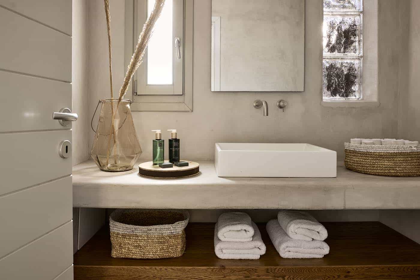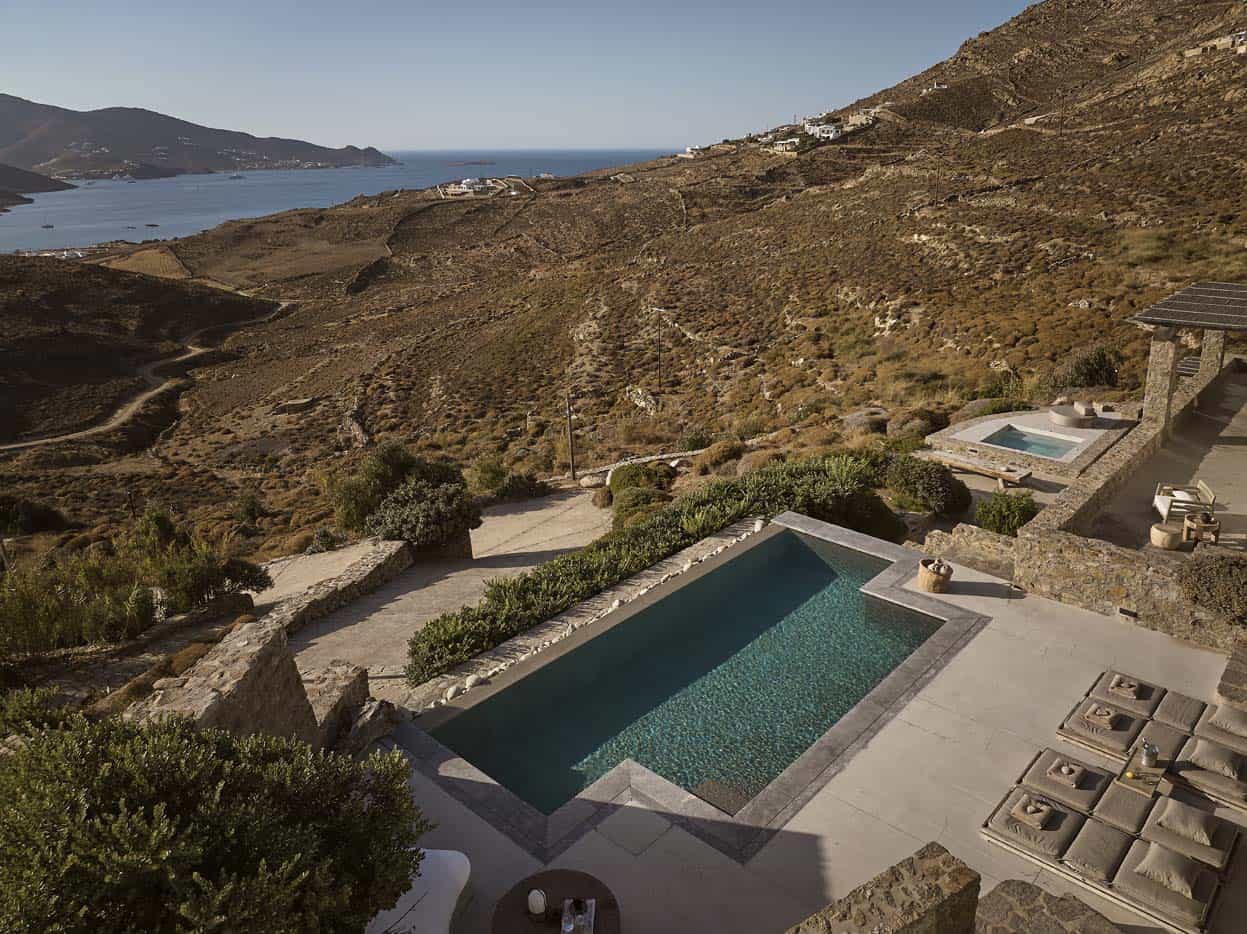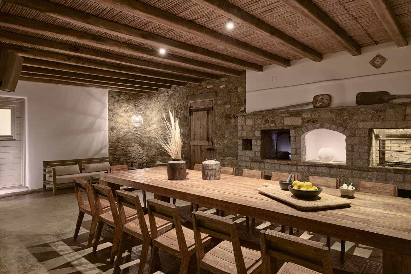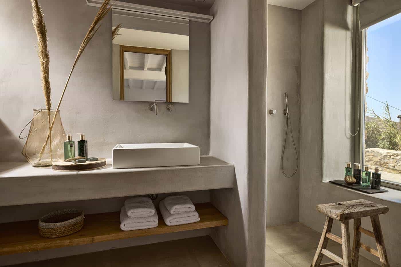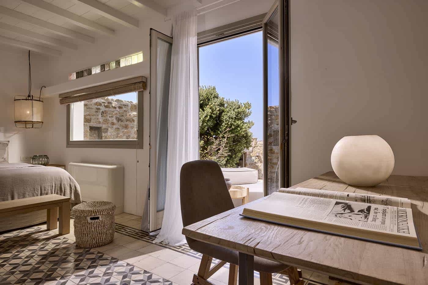 The guests have access to the 2 pools in the property (one of which may be heated upon request), the outdoor Jacuzzi, the beautiful gardens that surround the villa and the gym, while the Hammam facilities are available upon request. The outdoor dining area is situated right above the pool and offers a truly astounding view of the Aegean sky and sea. The suites feature rustic furnishings and spacious balconies or verandas.