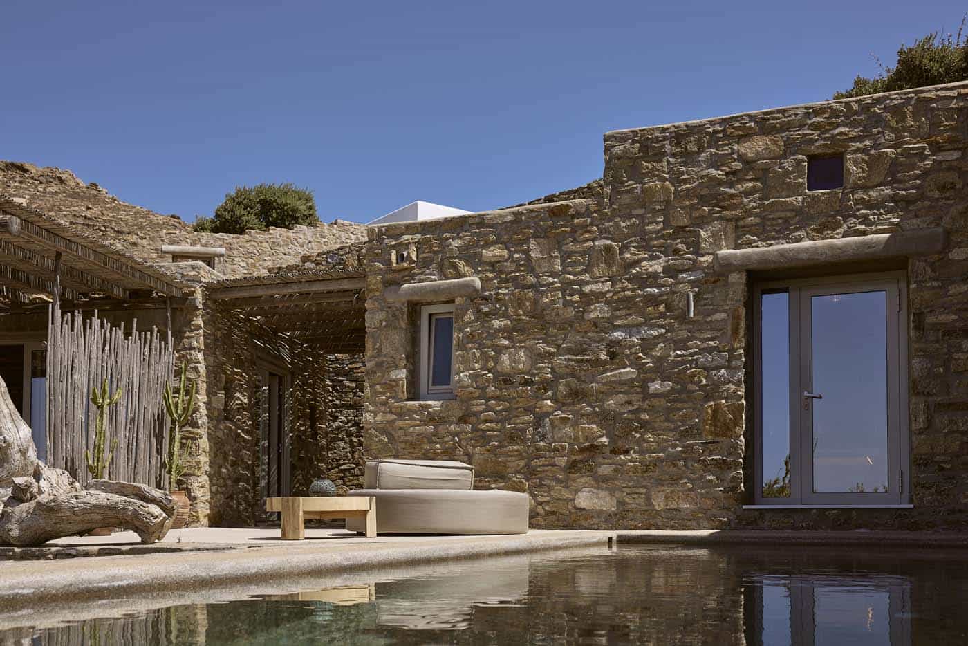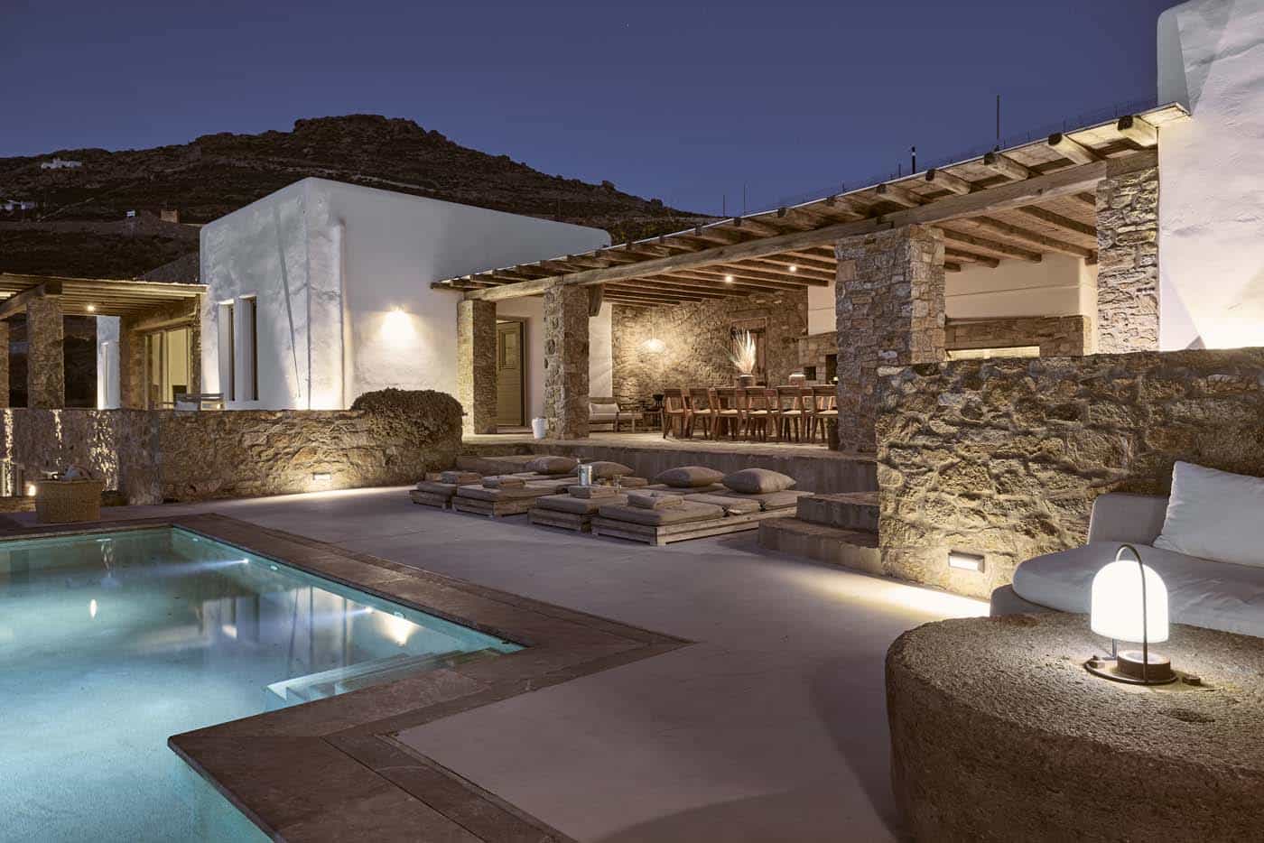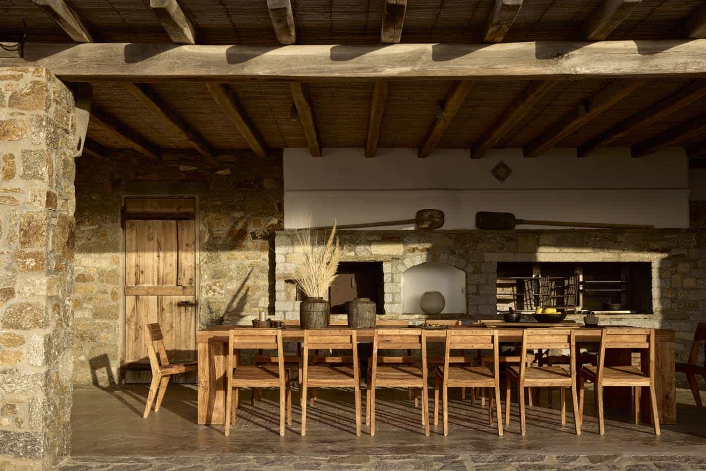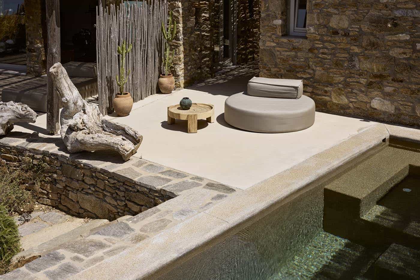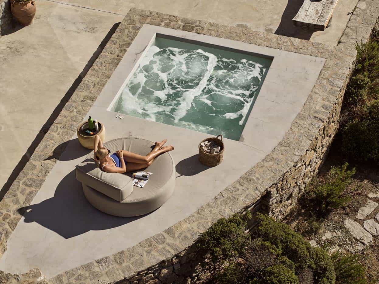 The guests have access to the 2 pools in the property (one of which may be heated upon request), the outdoor Jacuzzi, the beautiful gardens that surround the villa and the gym, while the Hammam facilities are available upon request. The outdoor dining area is situated right above the pool and offers a truly astounding view of the Aegean sky and sea. The suites feature rustic furnishings and spacious balconies or verandas.