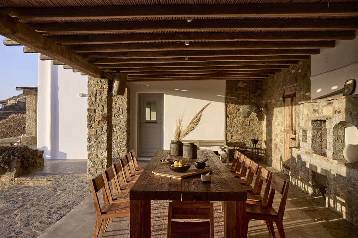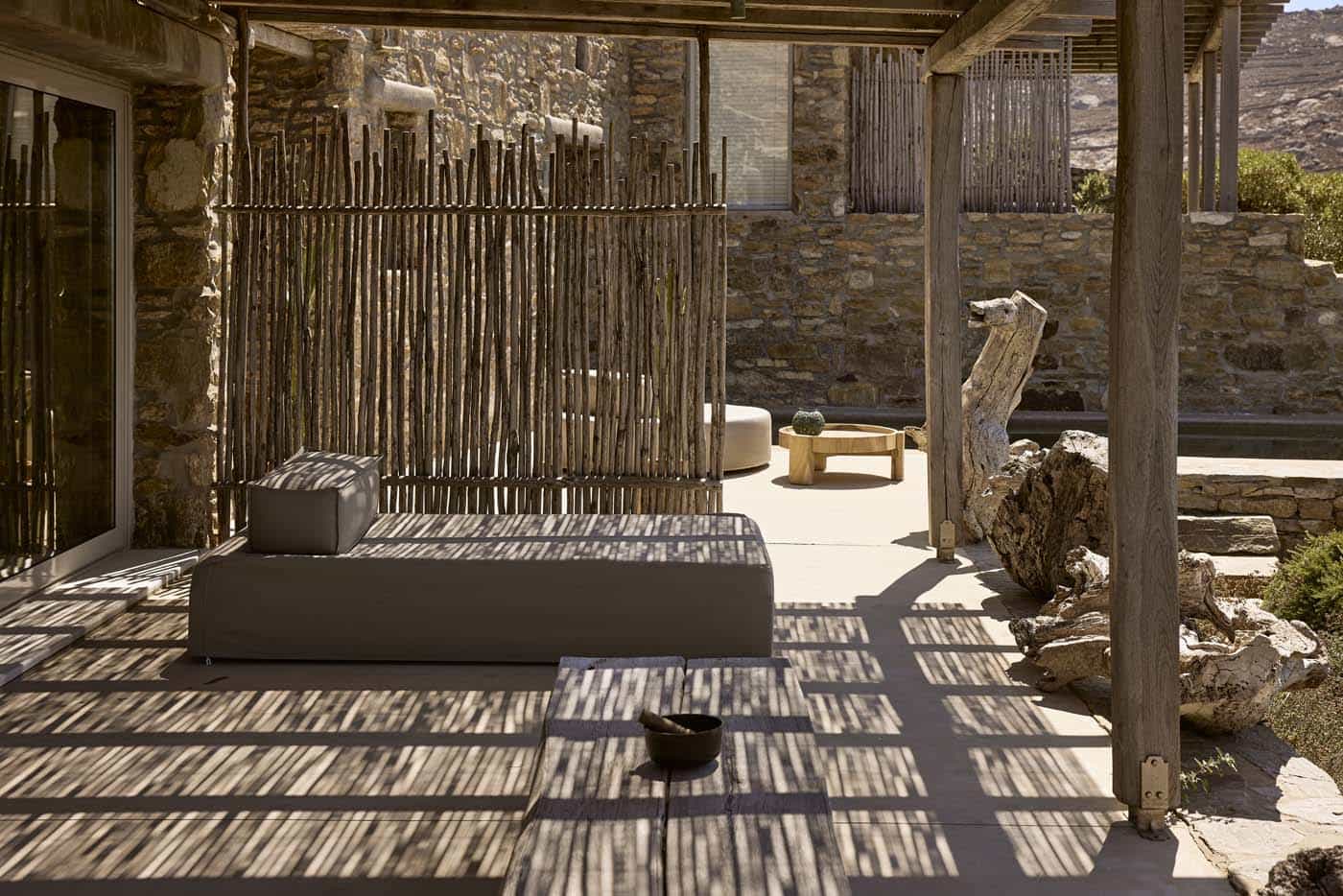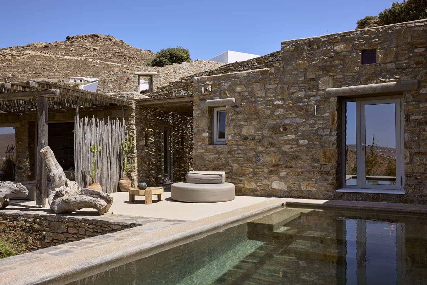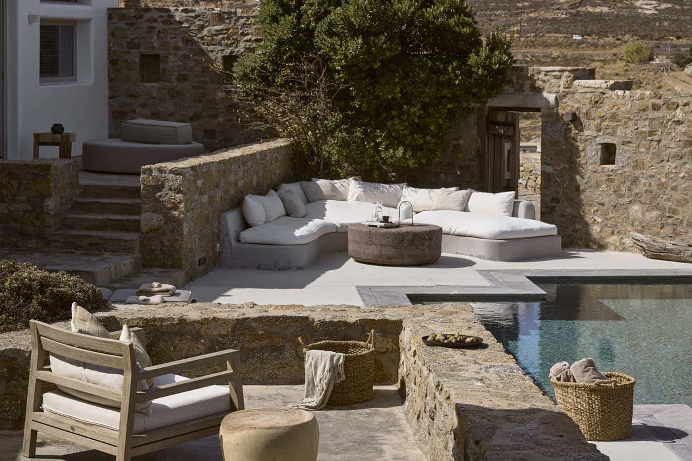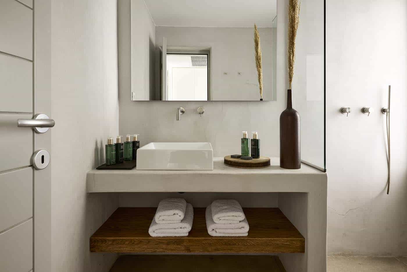 The guests have access to the 2 pools in the property (one of which may be heated upon request), the outdoor Jacuzzi, the beautiful gardens that surround the villa and the gym, while the Hammam facilities are available upon request. The outdoor dining area is situated right above the pool and offers a truly astounding view of the Aegean sky and sea. The suites feature rustic furnishings and spacious balconies or verandas.