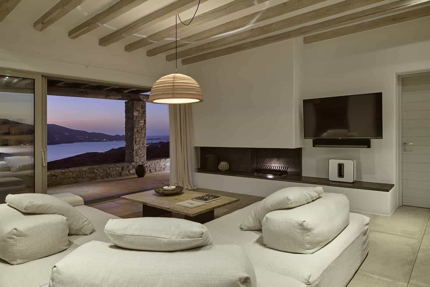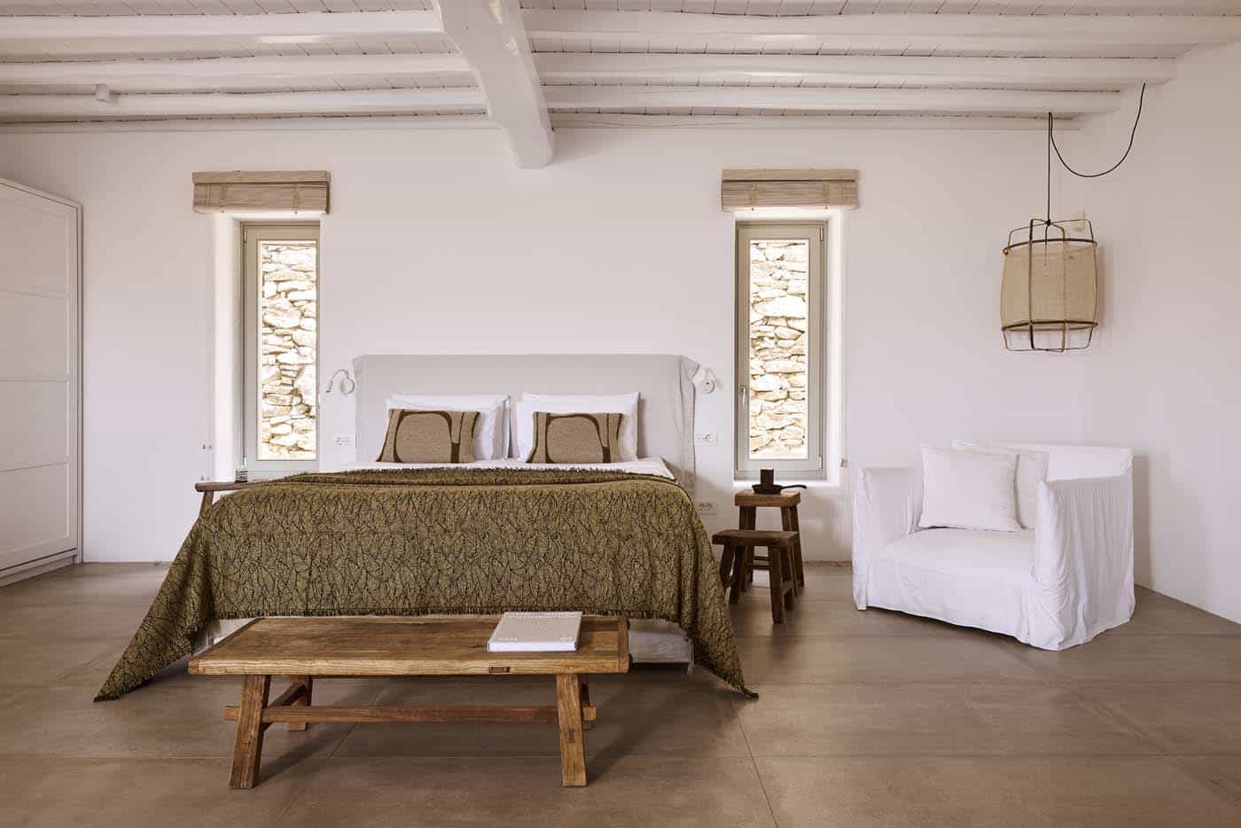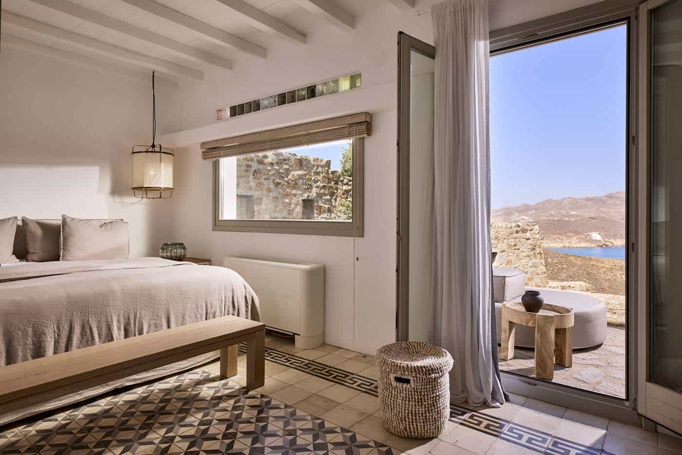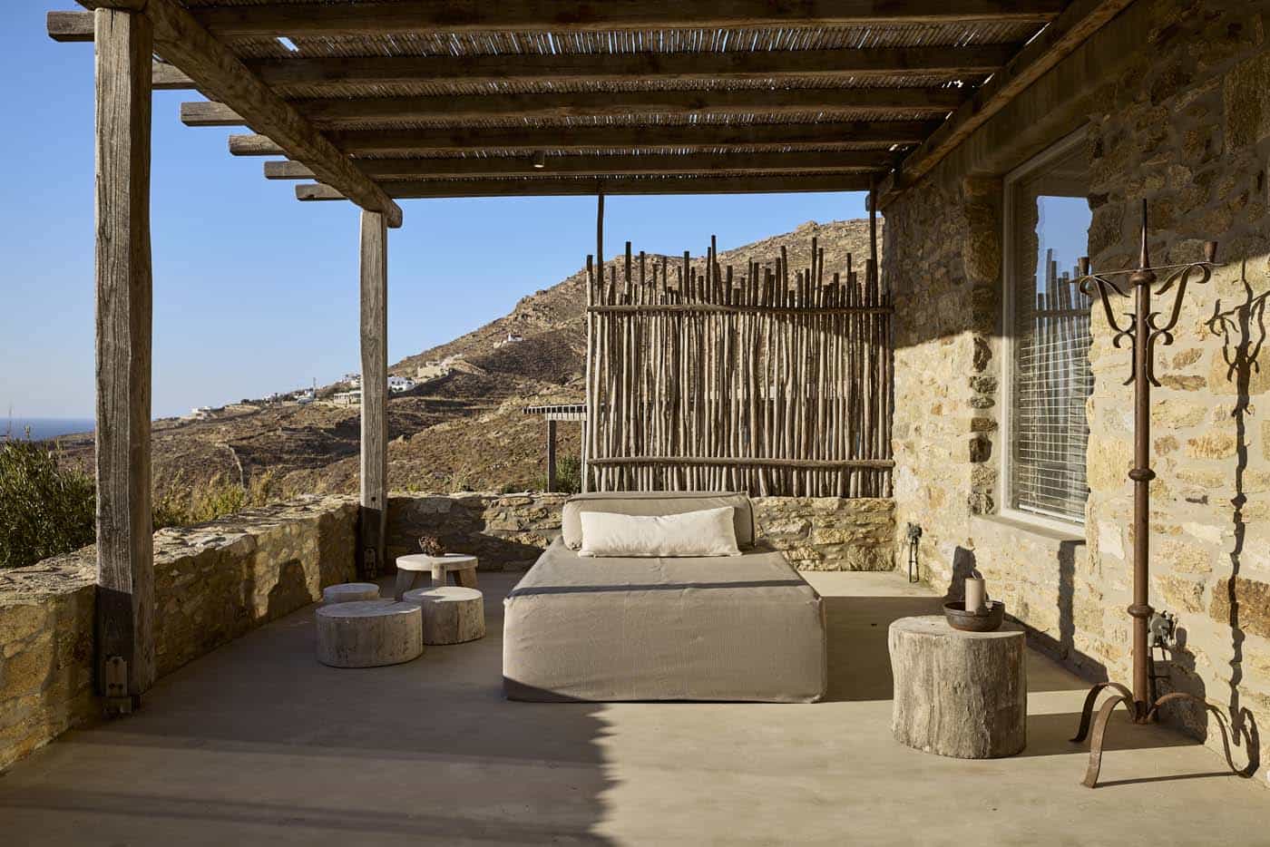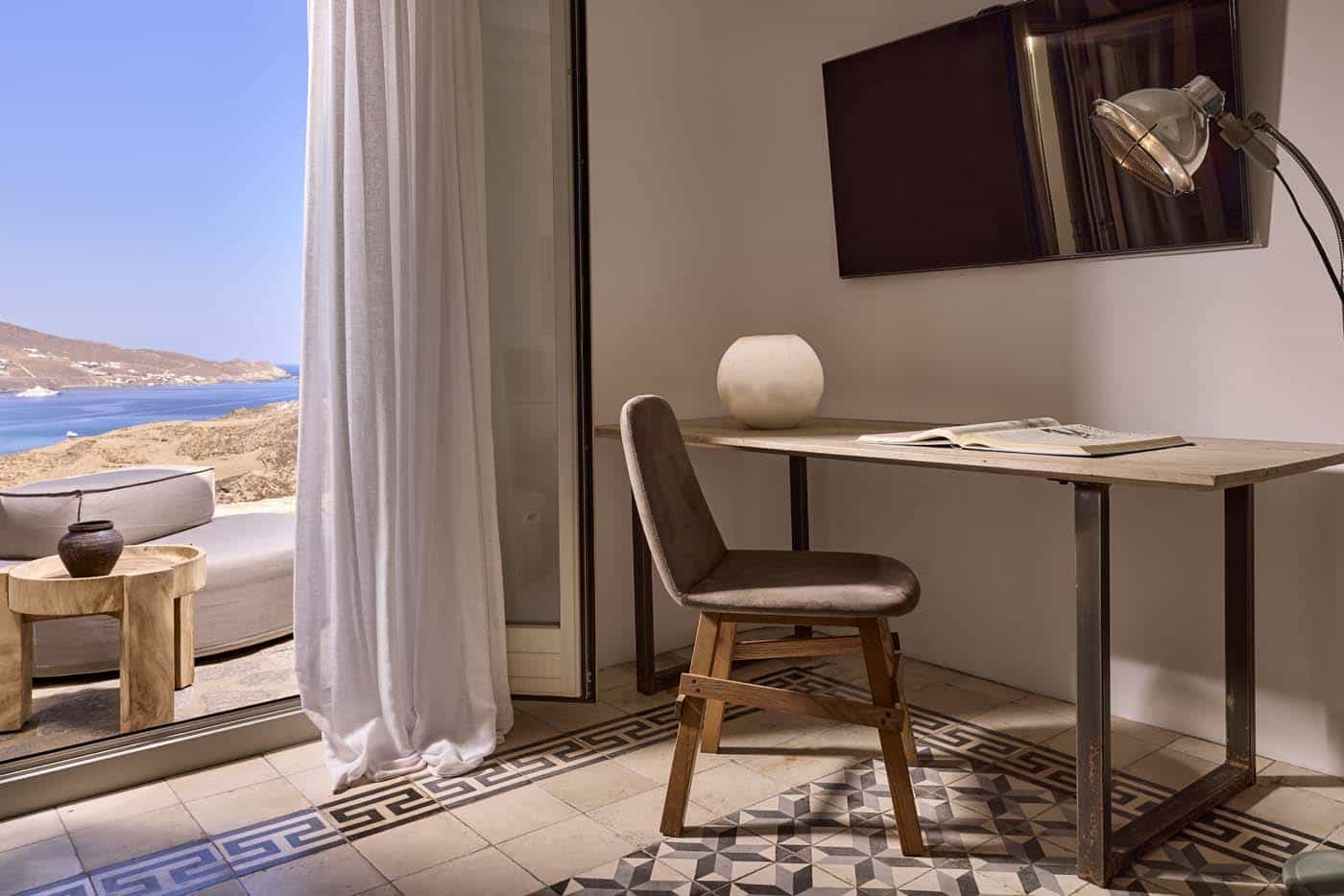 The guests have access to the 2 pools in the property (one of which may be heated upon request), the outdoor Jacuzzi, the beautiful gardens that surround the villa and the gym, while the Hammam facilities are available upon request. The outdoor dining area is situated right above the pool and offers a truly astounding view of the Aegean sky and sea. The suites feature rustic furnishings and spacious balconies or verandas.