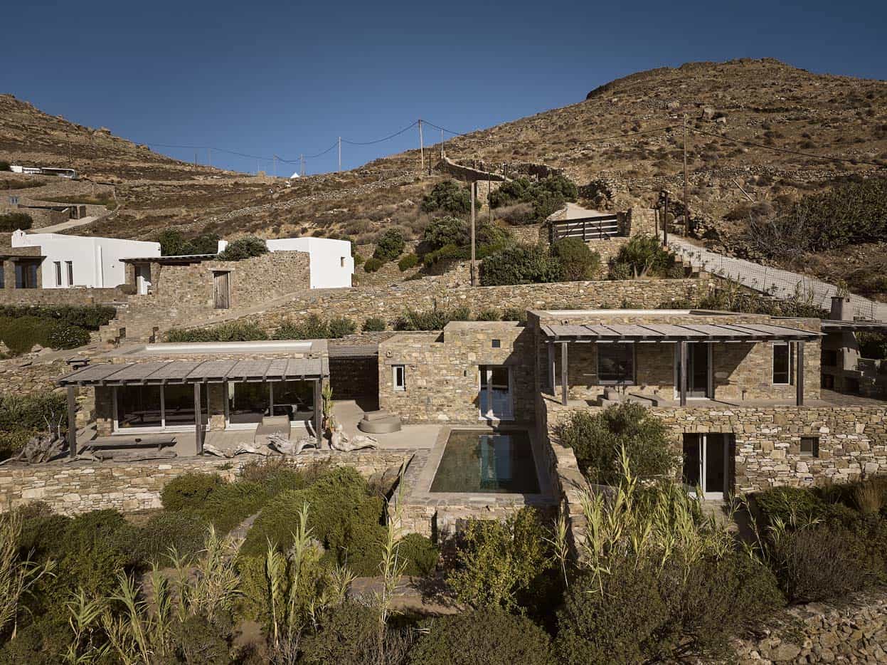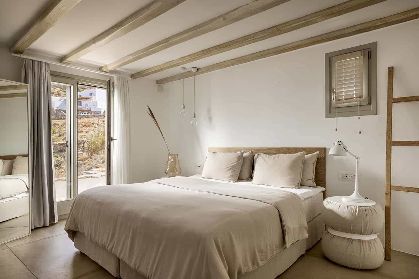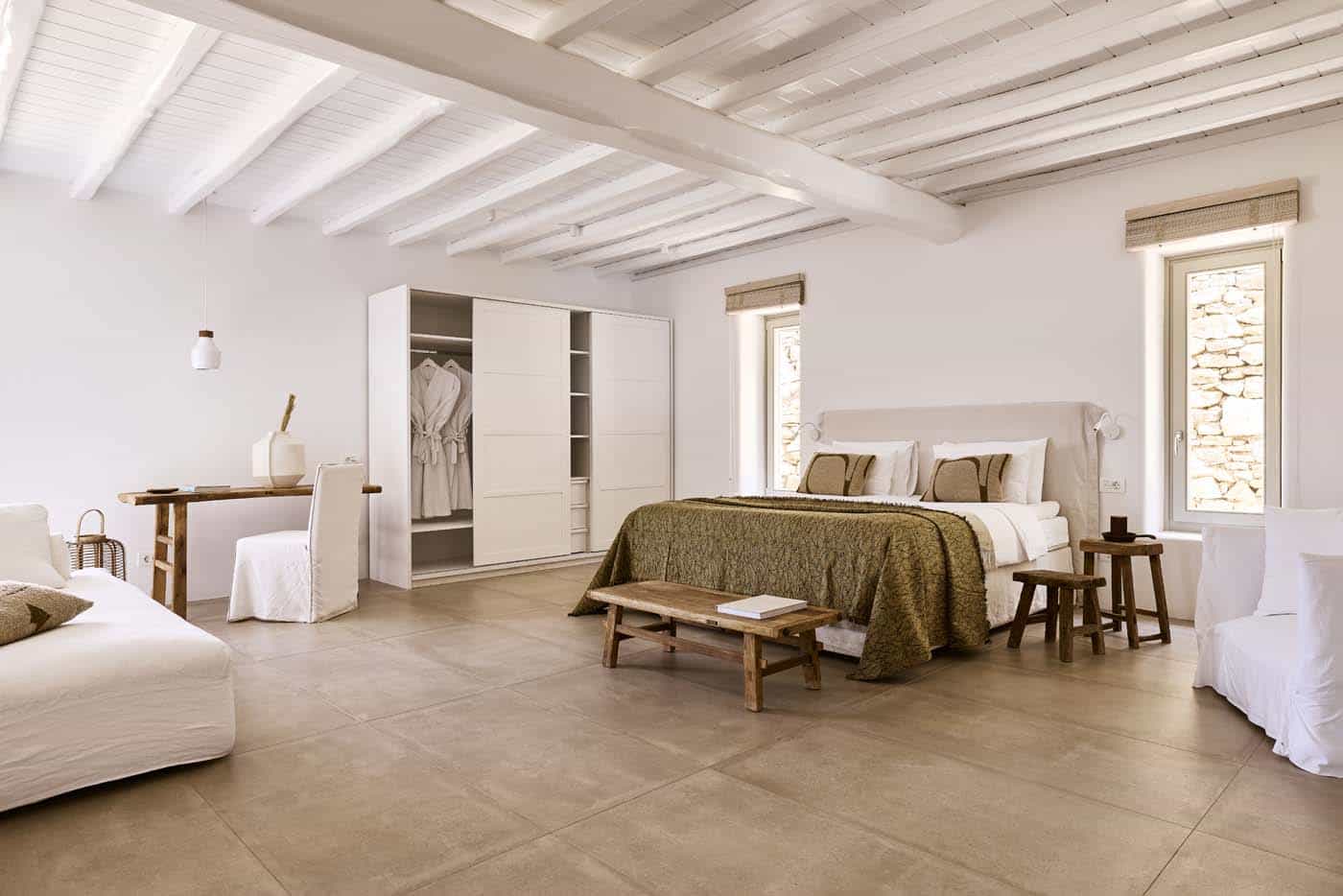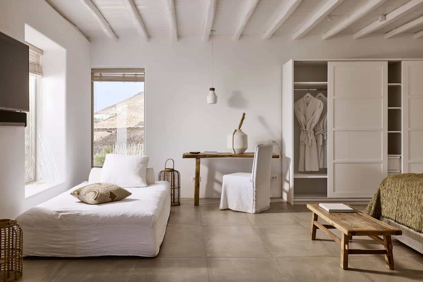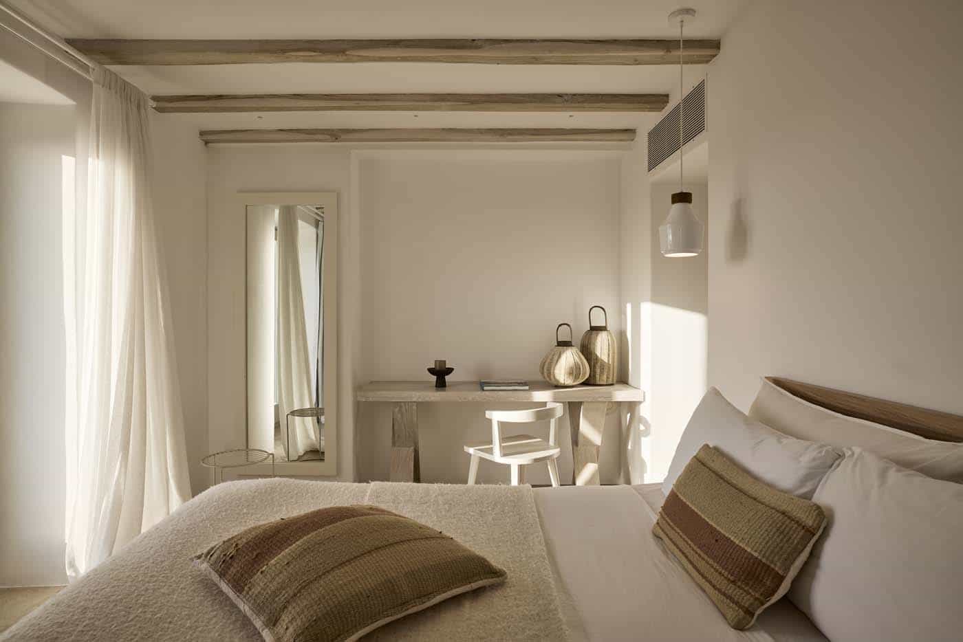 The guests have access to the 2 pools in the property (one of which may be heated upon request), the outdoor Jacuzzi, the beautiful gardens that surround the villa and the gym, while the Hammam facilities are available upon request. The outdoor dining area is situated right above the pool and offers a truly astounding view of the Aegean sky and sea. The suites feature rustic furnishings and spacious balconies or verandas.