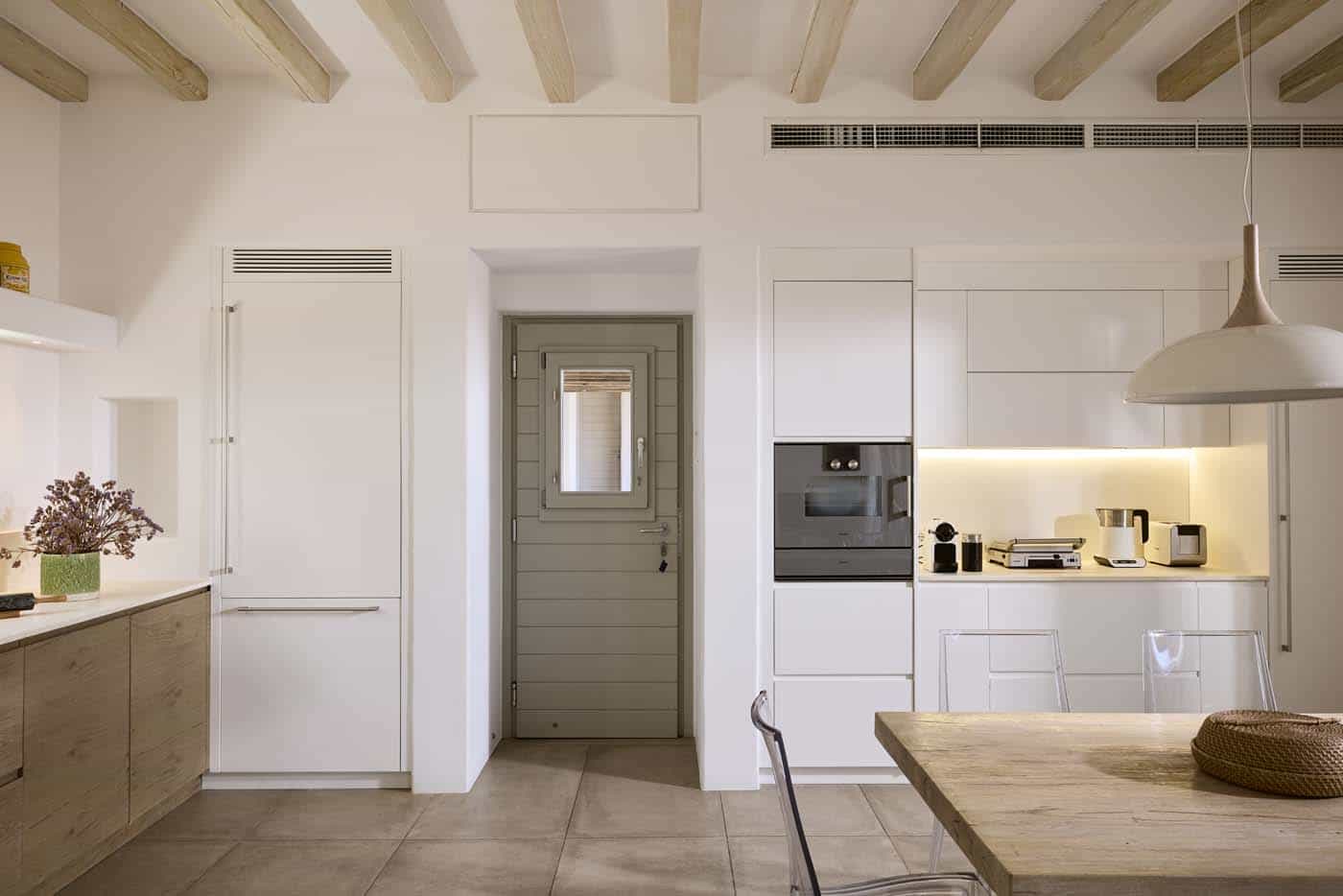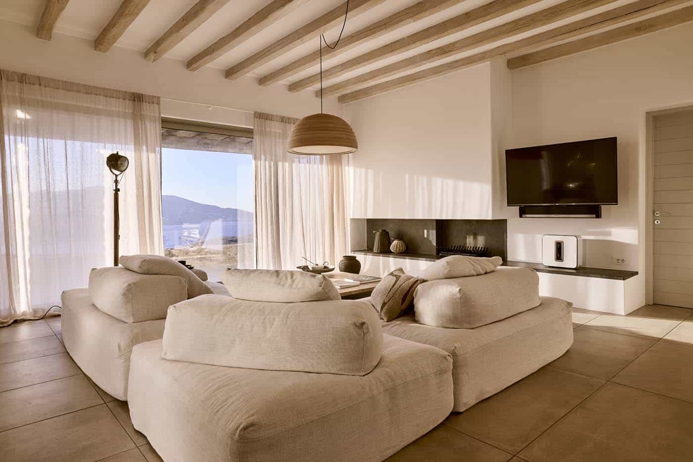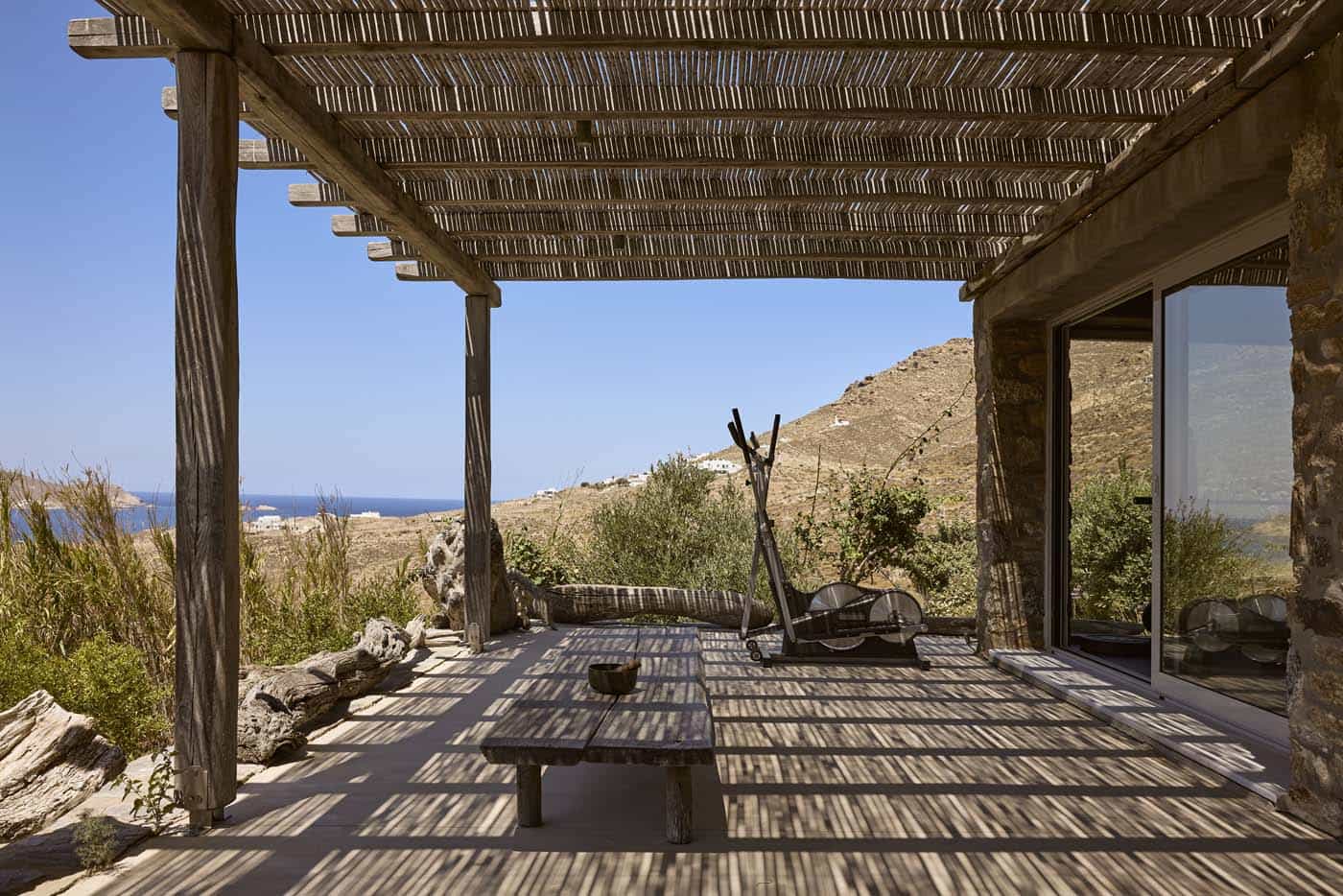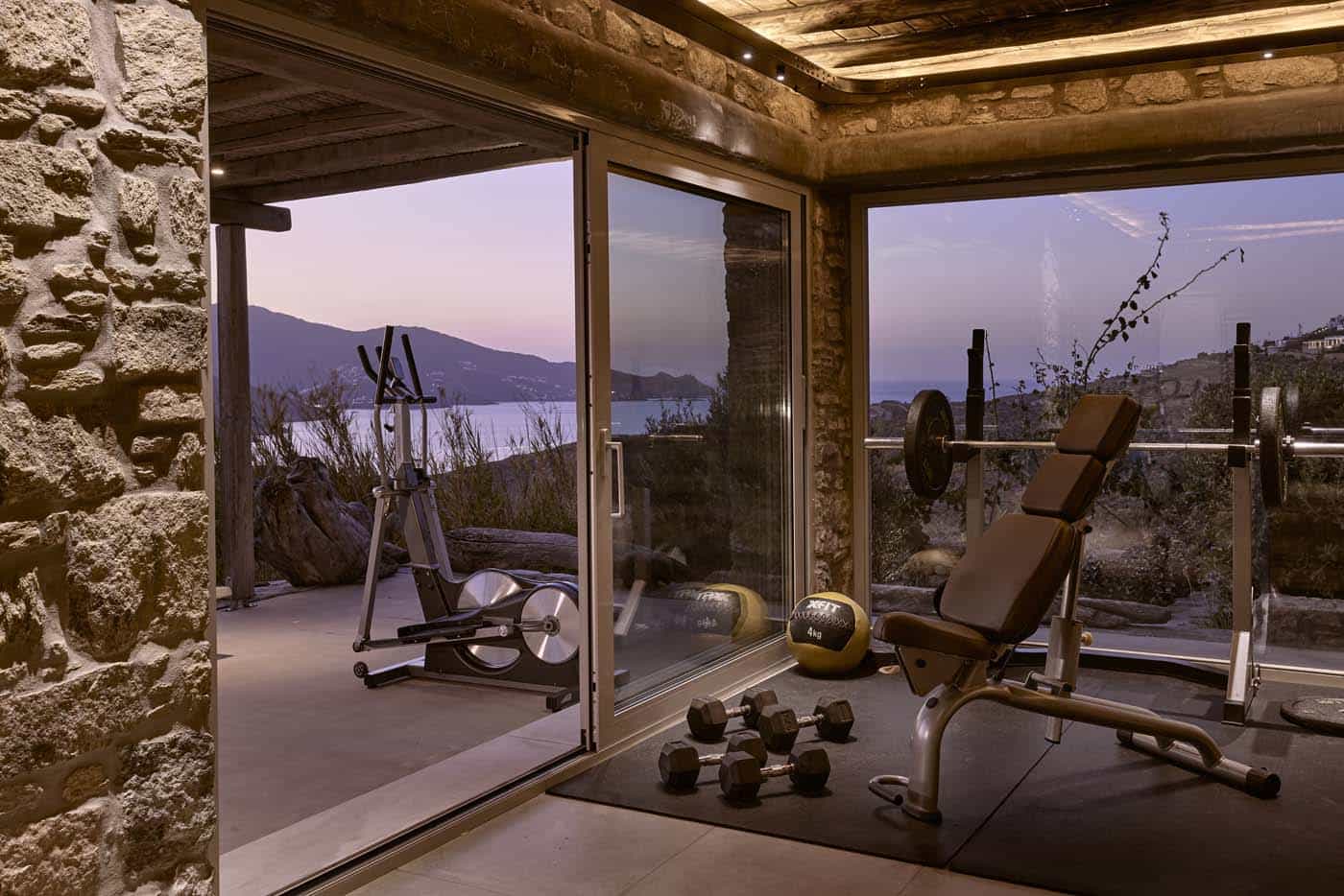 • Gym (70m2) overlooking Ftelia beach, with a glass window/wall that opens to connect the space with the outdoor area.