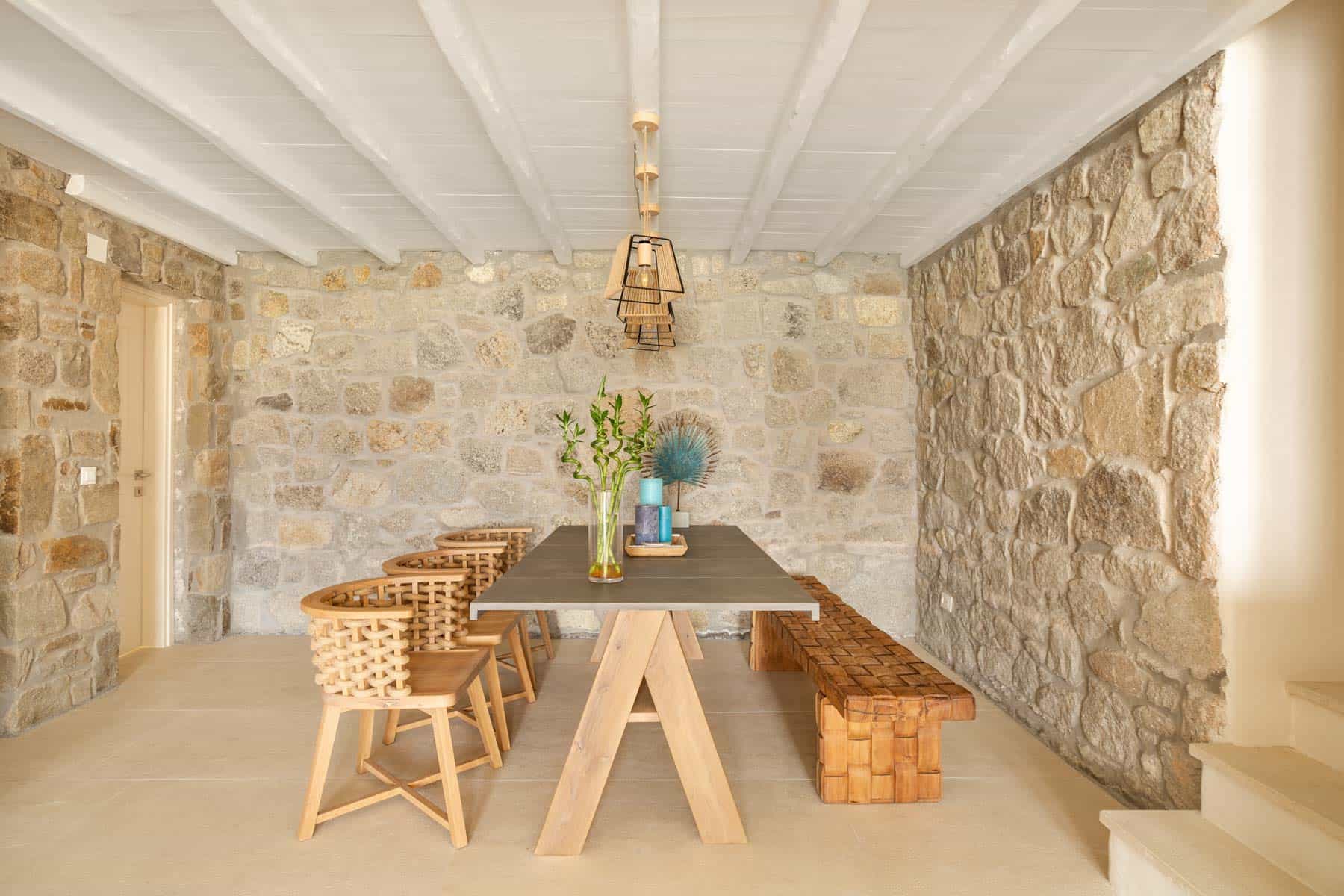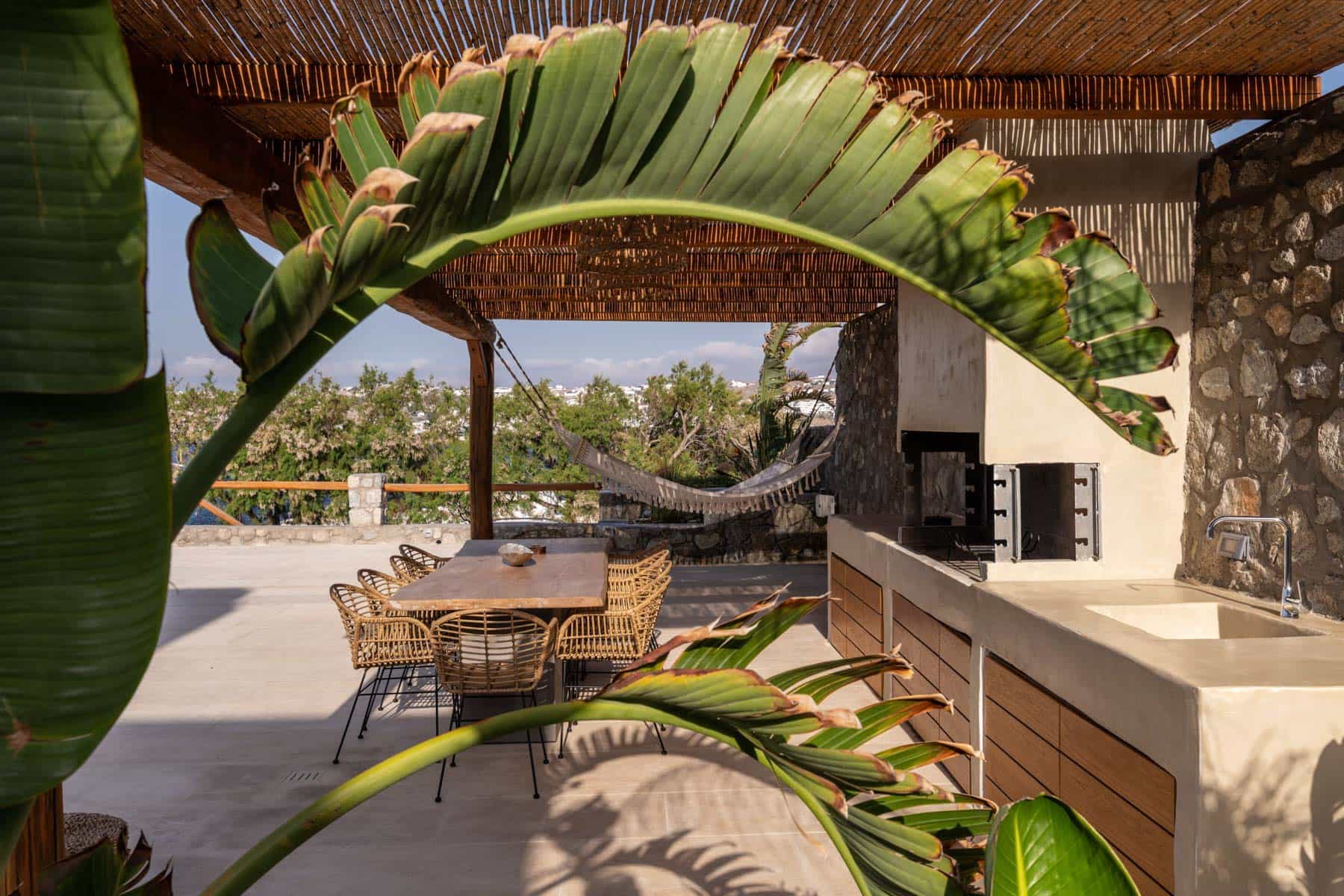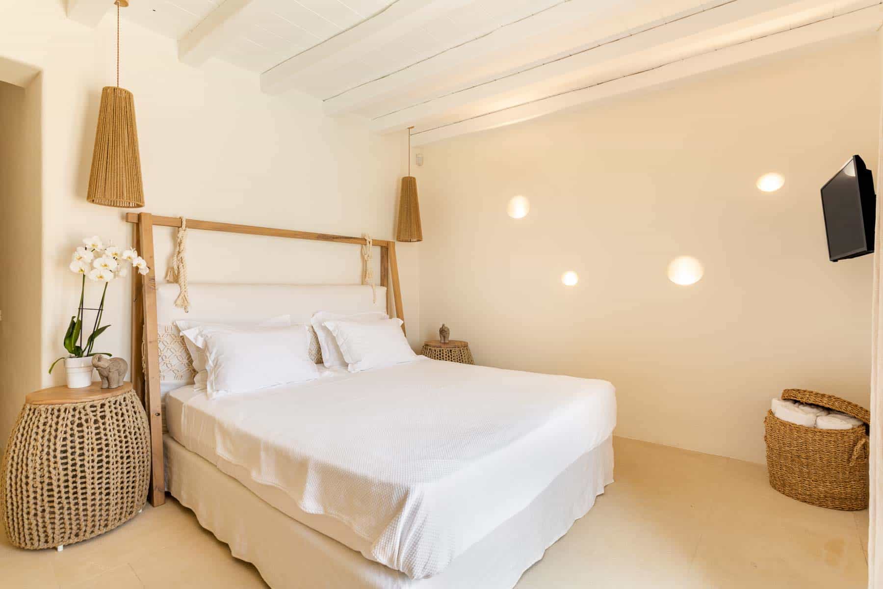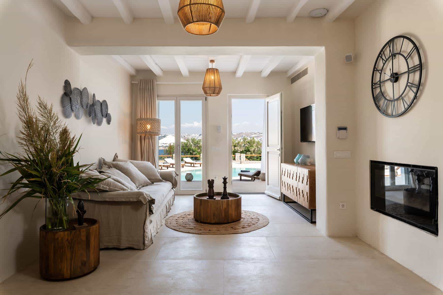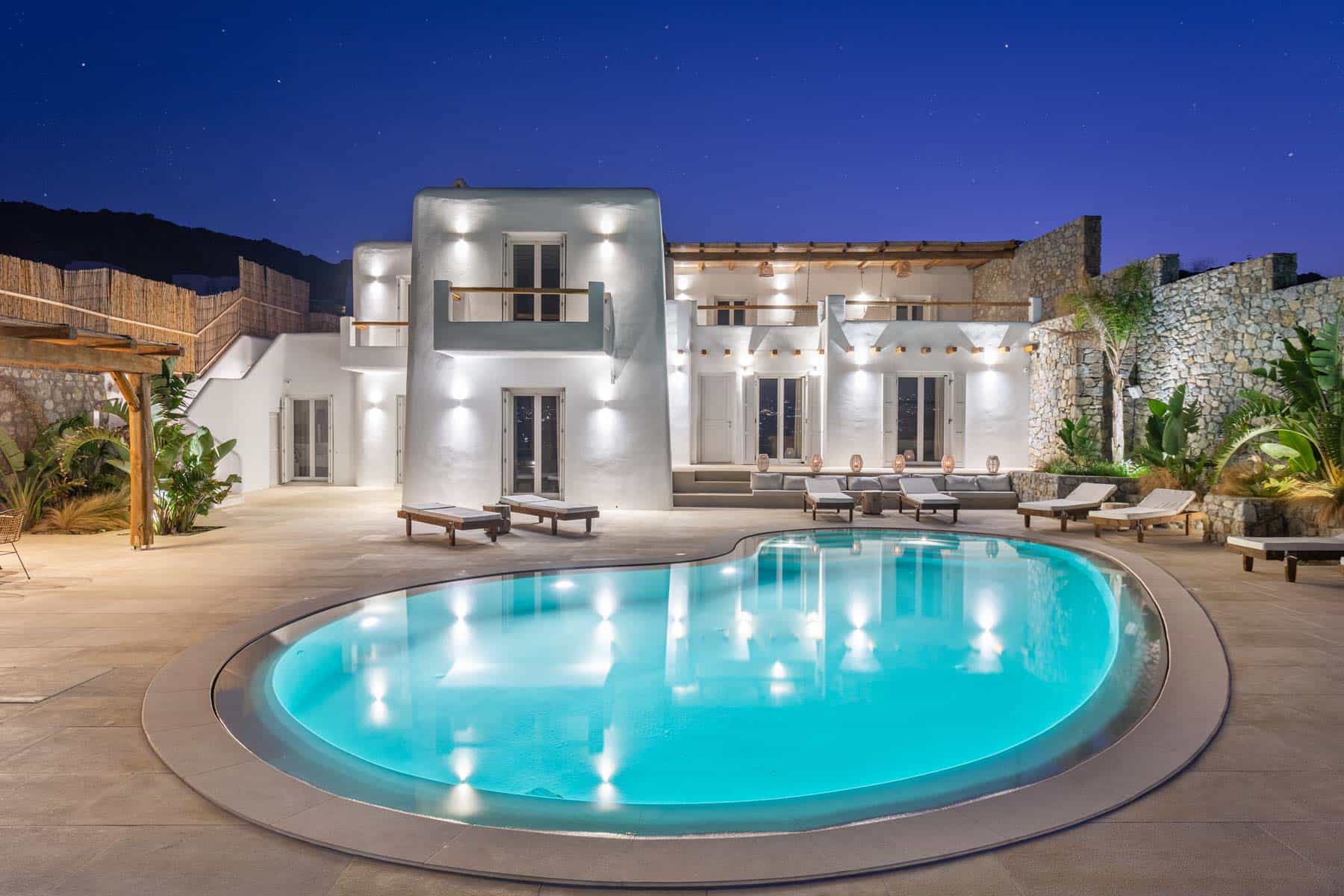 Bathed in the world famous Cycladic light and cooled by the Aegean breeze, it is one of the most luxurious  Villas in Mykonos, with two adjacent guest apartments, built on a plot of  1,000 sq.m., and offers the ideal holiday destination for large families or groups of friends (up to 16 persons). The main villas combine traditional and modern Cycladic design, luxury and absolute privacy. Incredible attention is devoted to every single detail, with an outdoorsy approach that does not compromise the cozy indoor living, elegant decoration with wooden furniture, Home Decor, chestnut ceilings.